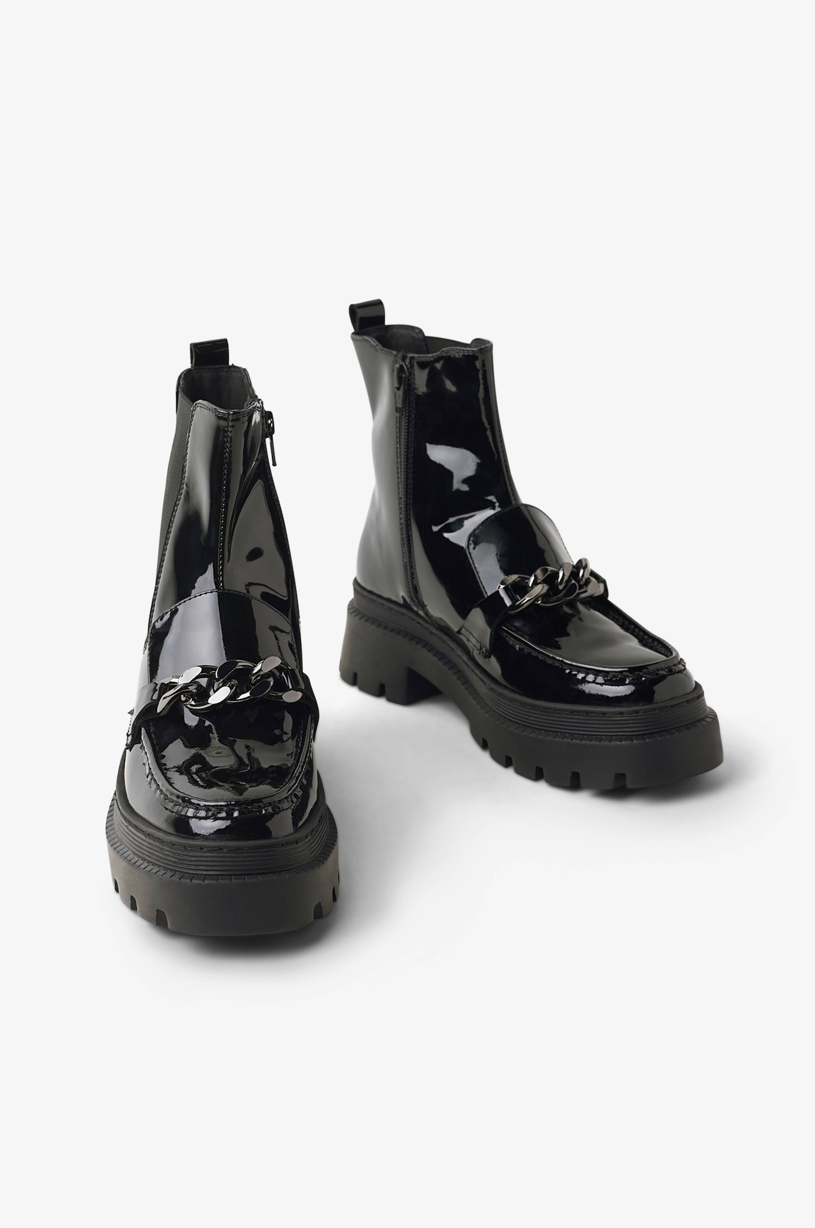 • Boots i patent læder• Lynlås på indersiden af skaftet• Elastisk panel på ydersiden af skaftet• Dekorativ kant ved tæerne• Dekorativ metalkæde over foden• Grov sål• Hælhøjde: 4,5 cm• Skafthøjde: 15,5 cm i str. 37