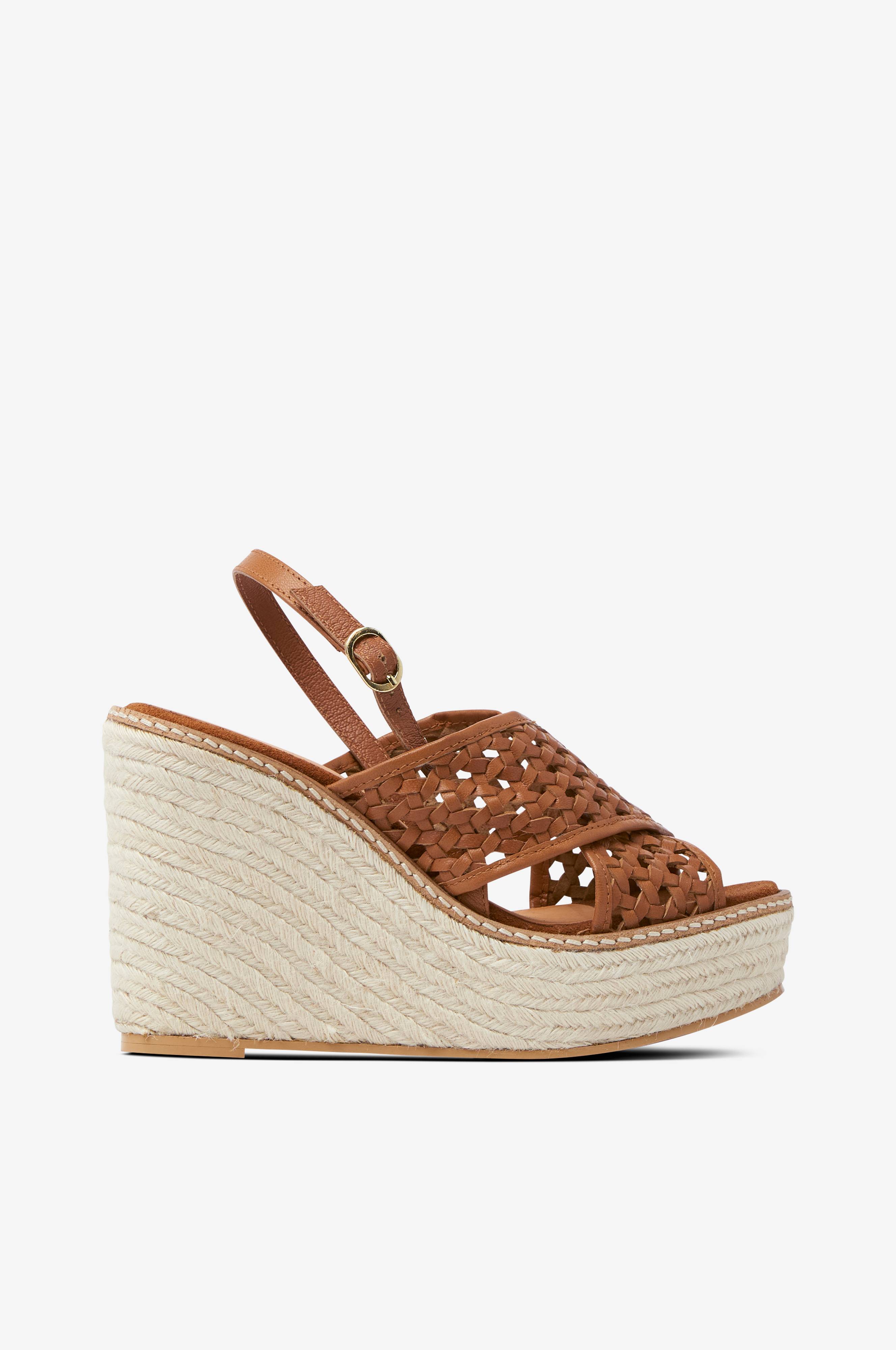 Høj sandal med rebklædt plateausål og kilehæl. Brede, krydsede remme med flettet mønster over foden. Smal rem med justerbar spænde rundt om hælen. Hælhøjde ca. 11 cm, plateau foran ca. 3,5 cm.