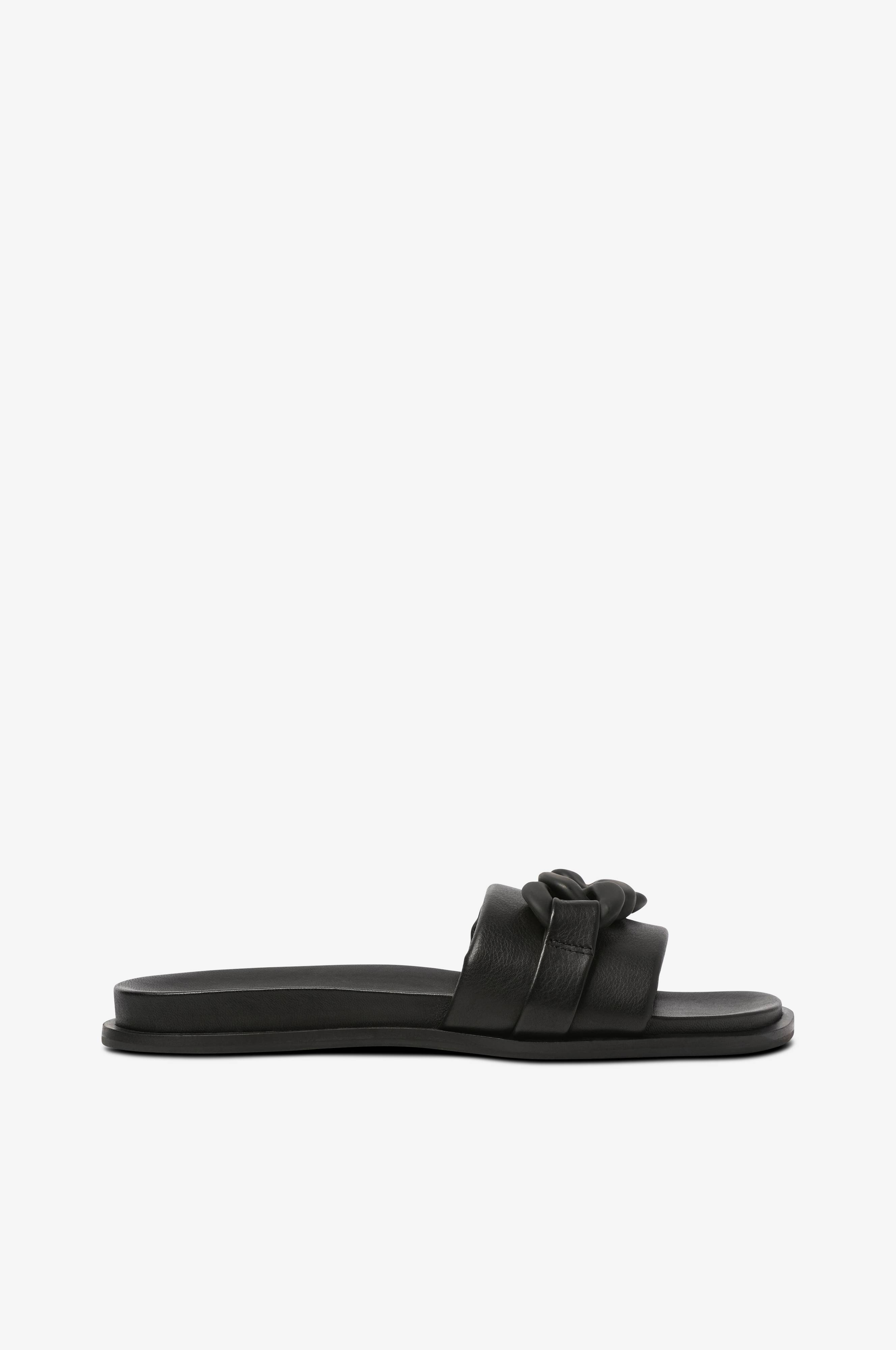 Sandaler i skind med dekorativt kædesmykke i syntet foran. Remmen over foden er skønt vatteret. Let formet fodseng for komfort.