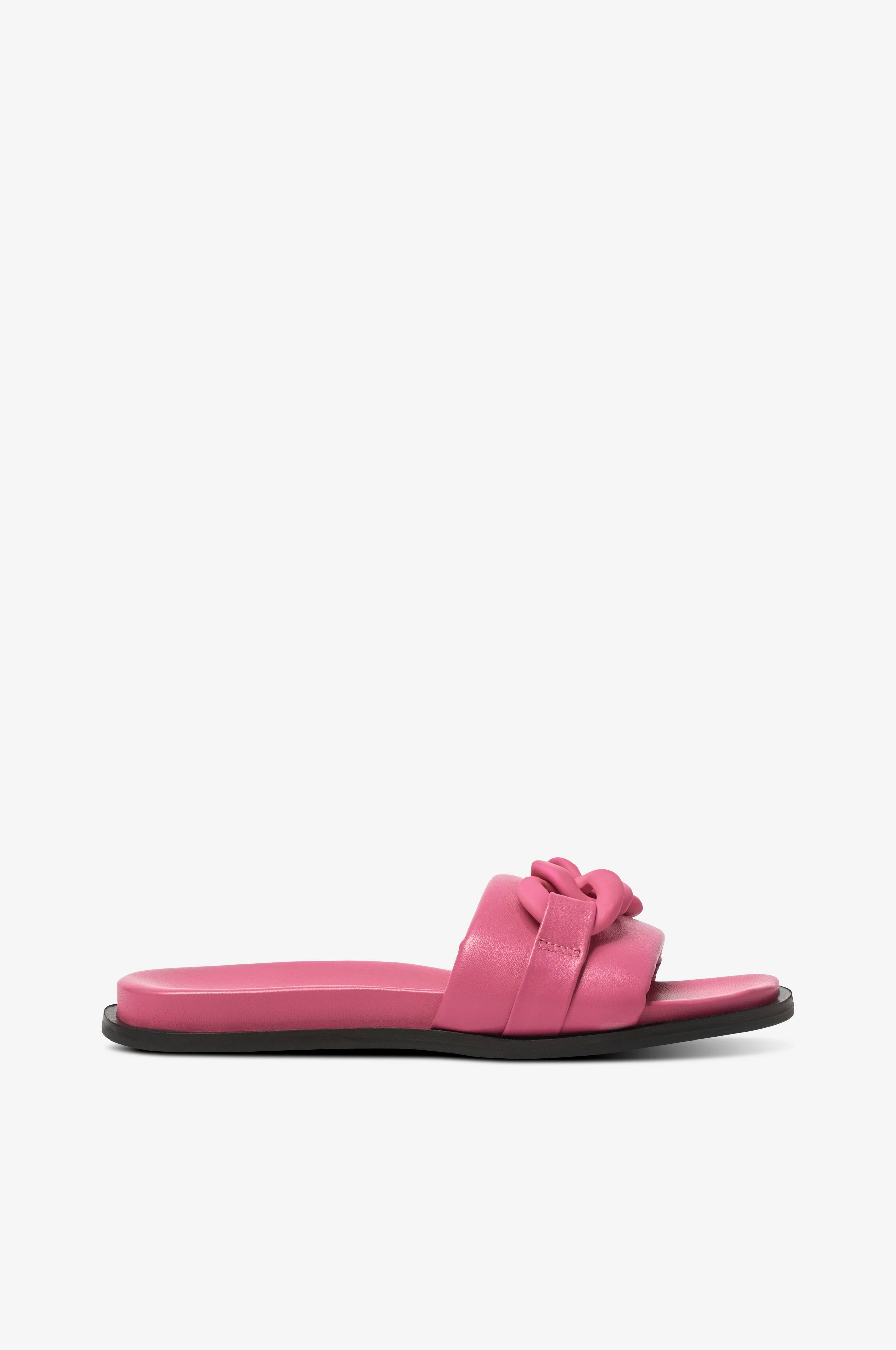 Sandaler i skind med dekorativt kædesmykke i syntet foran. Remmen over foden er skønt vatteret. Let formet fodseng for komfort.