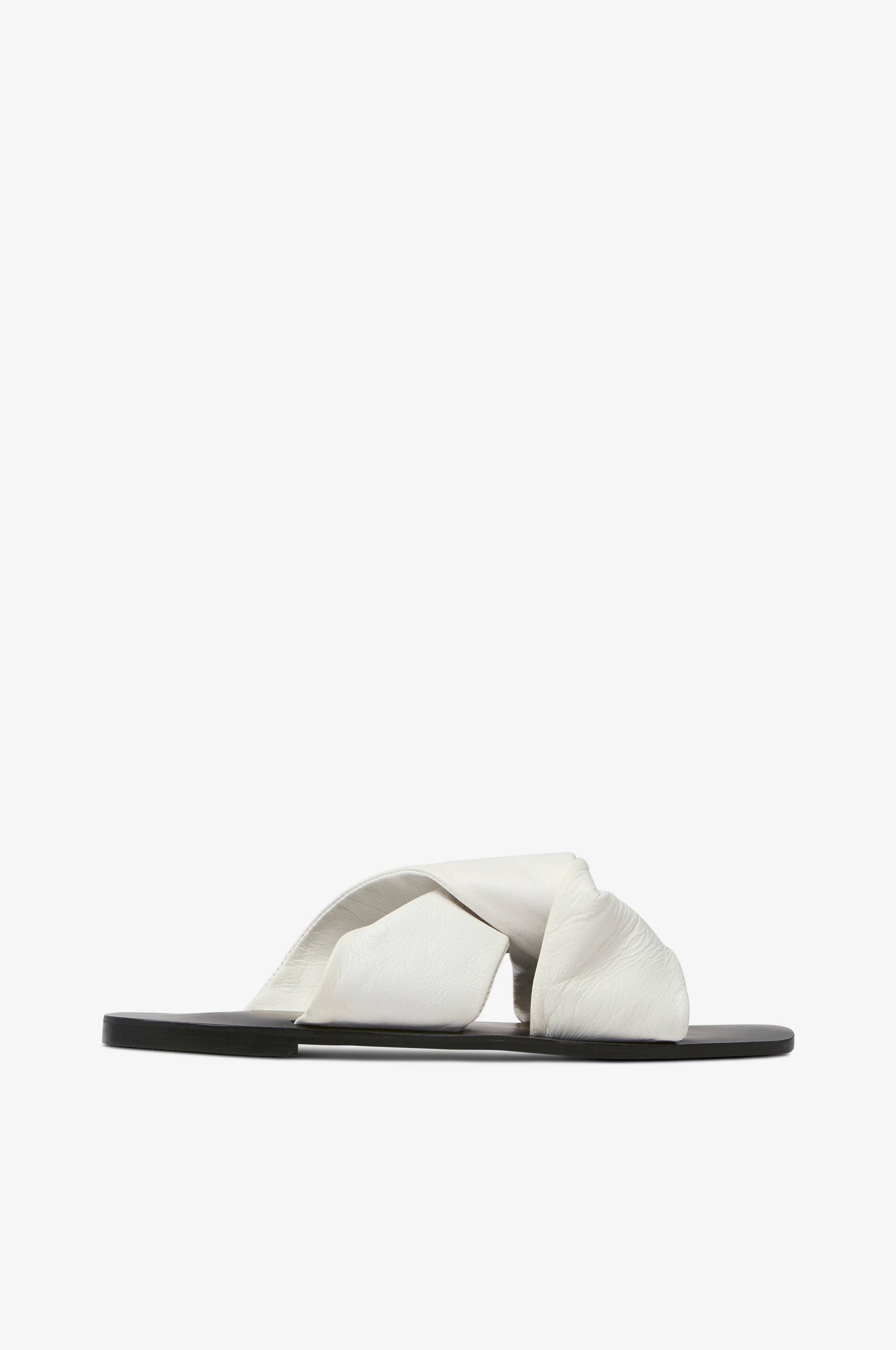 Lav model med lille hæl og brede remme i skind som er snoet om hinanden.
