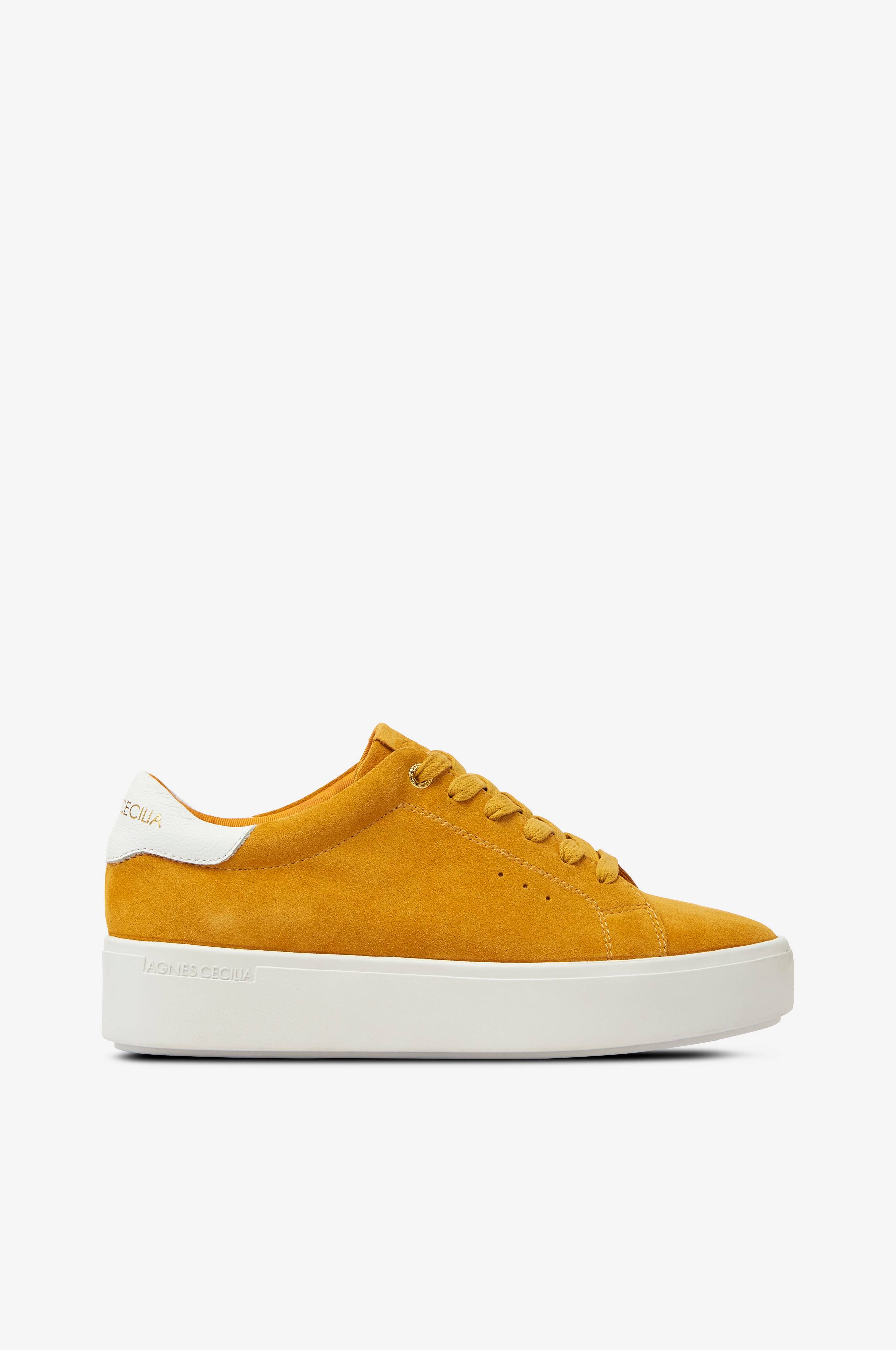 Sneakers Wide Ribbon fra Agnes Cecilia i klassisk model med plateausål. Overdel i ruskind eller skind med kontrastfarvet parti med guldfarvet logo bagpå. Sålhøjde ca. 4 cm.
