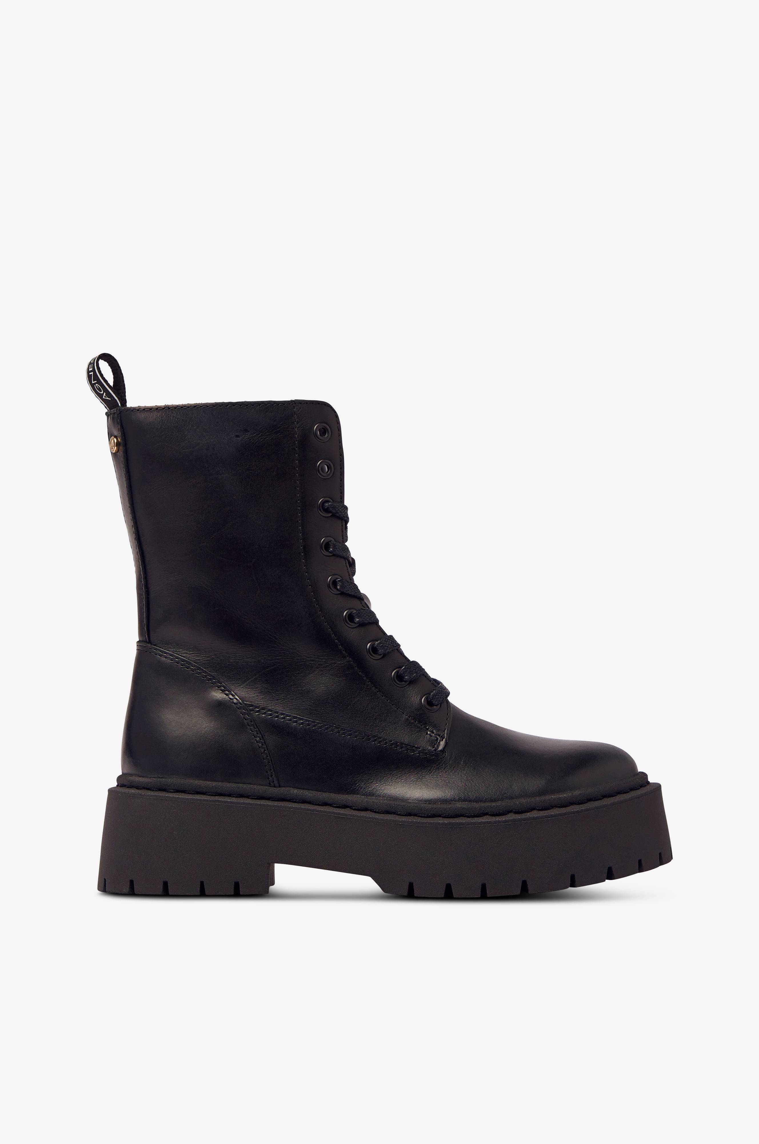 Støvle Oslo fra Agnes Cecilia. Model i let vægt med høj sål rundt om og groft sålmønster. Skaft med snøre foran og lynlås på indersiden samt hank bagpå. Skafthøjde ca. 17 cm. Sålhøjde ca. 3,5 cm. Hælhøjde ca. 4,5 cm. Obs: Små i størrelsen, vi anbefaler at du vælger en størrelse større end normalt.