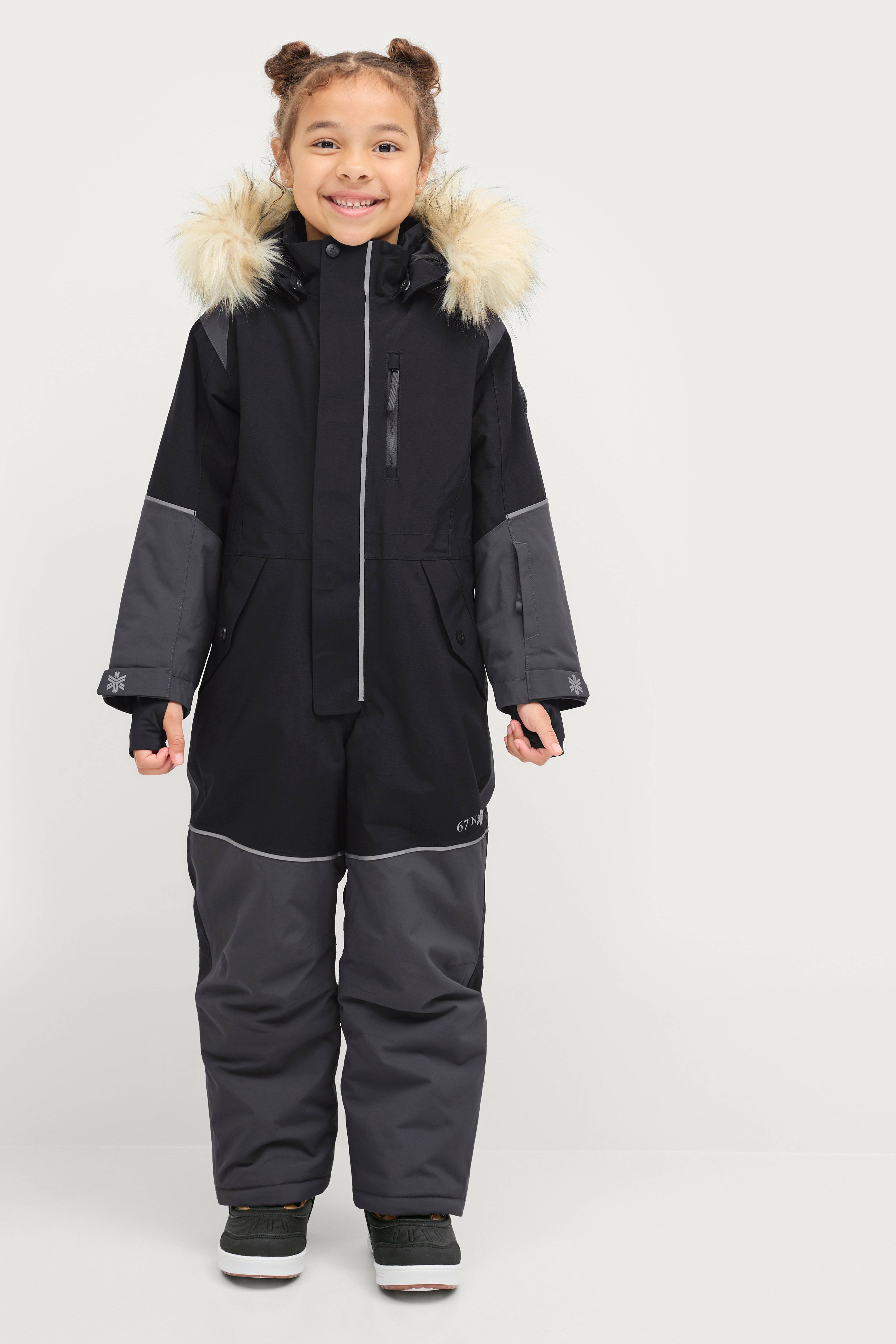 Aftagelig og justerbar hætte med aftagelig kant af kunstpels. Høj krave med blød fleece på indersiden. Lynlås og beskyttende overfald med velcrolukning. To lommer foran med lynlås og håndvarmerfor. Regulerbar vidde i taljen. Regulerbar ærmekant med velcro og en indvendig ribkant i stretchjersey med hul til tommelfingeren. Elastisk snefang i benkant med antislip-bånd på indersiden som holder dem på plads. Regulerbar vidde i benkant og justerbare fodstropper i gummi. Refleksdetaljer hele vejen rundt.