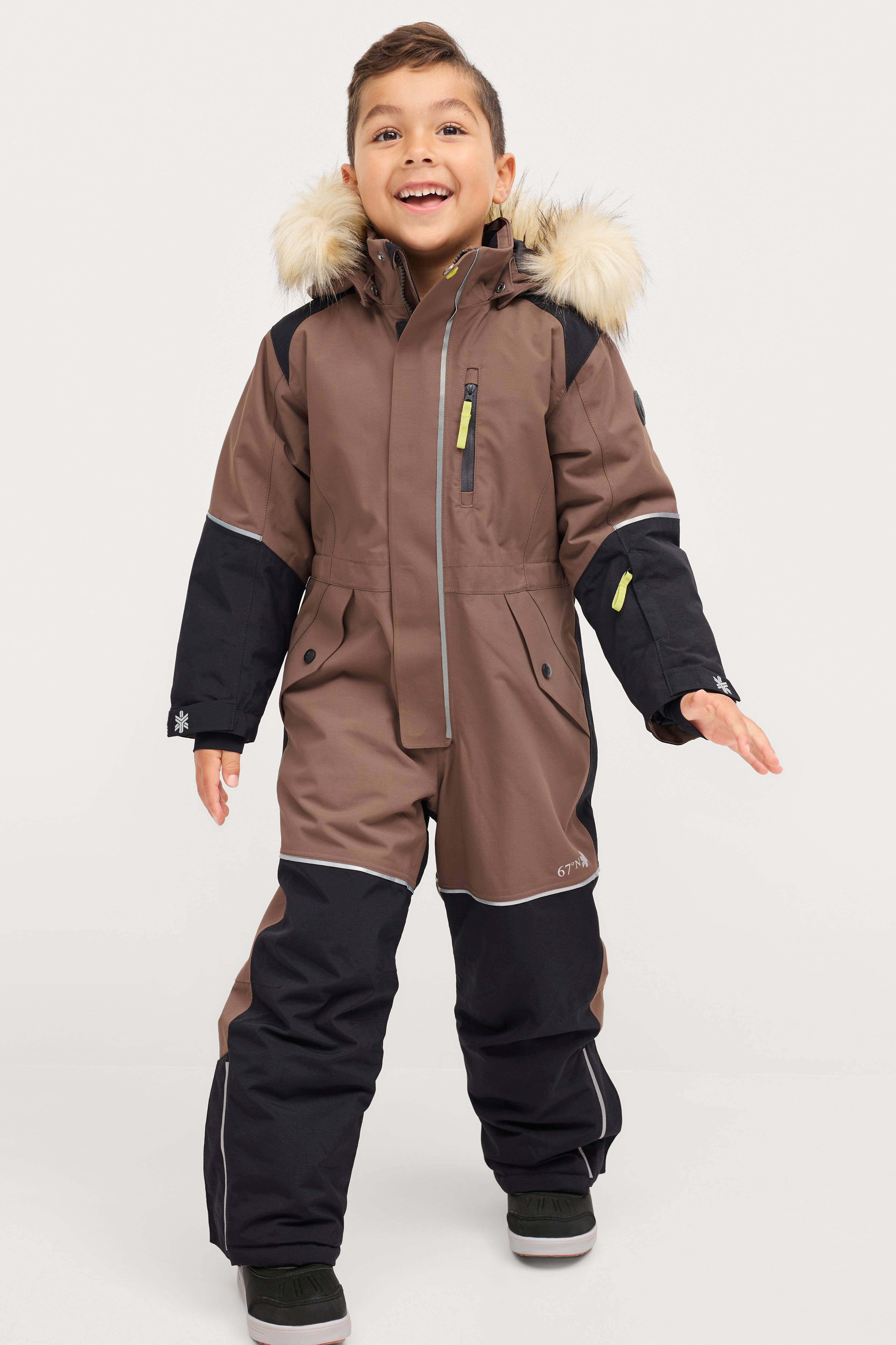 Aftagelig og justerbar hætte med aftagelig kant af kunstpels. Høj krave med blød fleece på indersiden. Lynlås og beskyttende overfald med velcrolukning. To lommer foran med lynlås og håndvarmerfor. Regulerbar vidde i taljen. Regulerbar ærmekant med velcro og en indvendig ribkant i stretchjersey med hul til tommelfingeren. Elastisk snefang i benkant med antislip-bånd på indersiden som holder dem på plads. Regulerbar vidde i benkant og justerbare fodstropper i gummi. Refleksdetaljer hele vejen rundt.