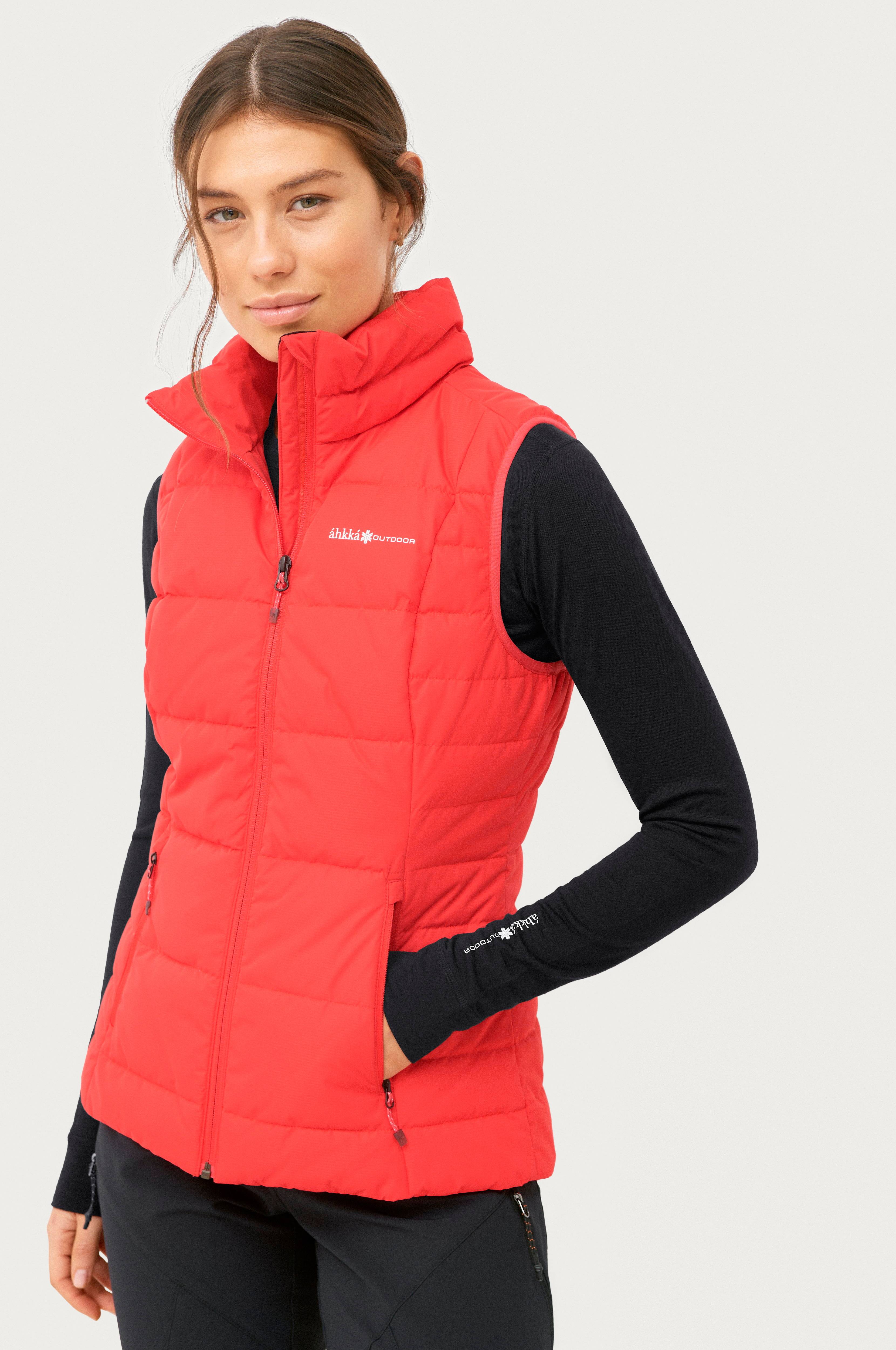 En let, quiltet dunvest fra Áhkká med feminint snit. Vævet yderstof i genindvundet polyester. Fyldet er en blanding af 60% dun/fjer (blandingen er 80% dun, 20% fjer) og 40% syntetisk materiale, som gør, at du både får dunets varme, lette egenskaber og de hurtigtørrende egenskaber ved det syntetiske materiale. Efter vask tørrer vesten hurtigere end en vest kun med dun. Vesten tørrer også lettere uden at fyldet klumper.