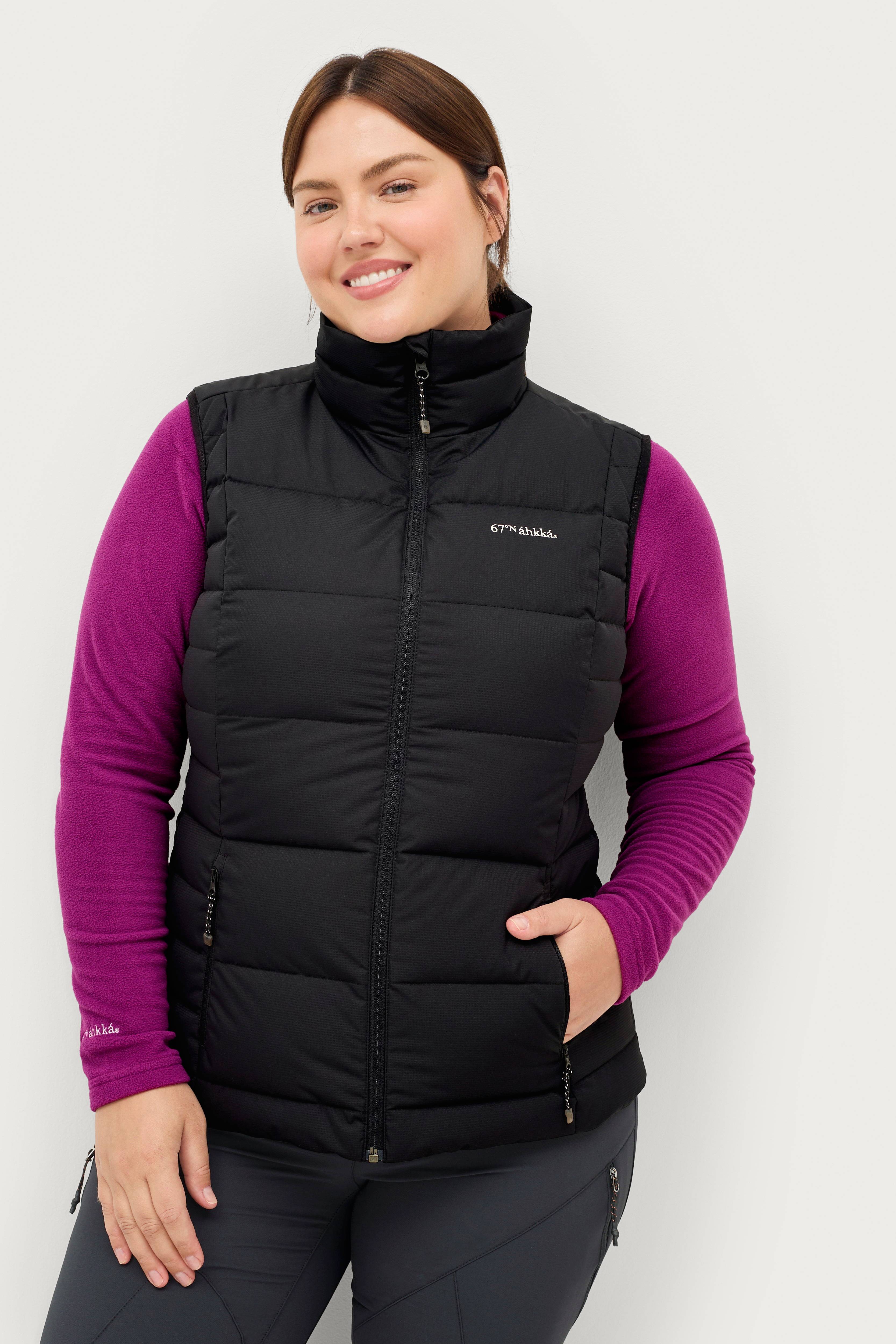 En let, quiltet dunvest fra Áhkká med feminint snit. Vævet yderstof i genindvundet polyester. Fyldet er en blanding af 60% dun/fjer (blandingen er 80% dun, 20% fjer) og 40% syntetisk materiale, som gør, at du både får dunets varme, lette egenskaber og de hurtigtørrende egenskaber ved det syntetiske materiale. Efter vask tørrer vesten hurtigere end en vest kun med dun. Vesten tørrer også lettere uden at fyldet klumper.