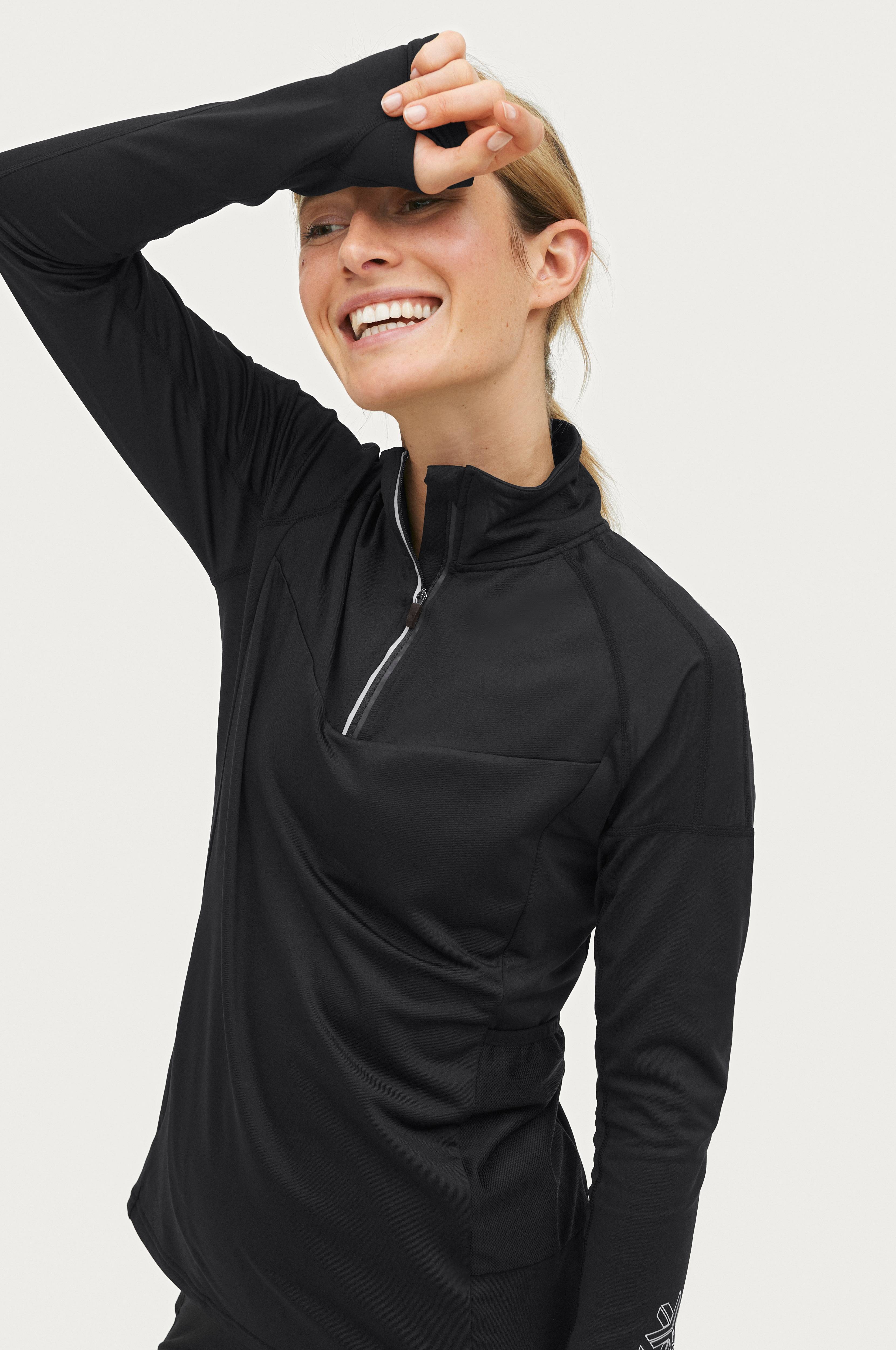 Funktionstrøje til løb/udendørstræning i skov eller by under lidt koldere vejrforhold. Trøjen er i et blødt stretchstof med varm, børstet inderside. Standkrave med kort lynlås. Hul til tommelfingeren i ærmekant og åbning til ur på venstre ærme. En lomme med tynd, smidig lynlås i højre side til f.eks. mobiltelefonen. Lomme i mesh på den anden side. Bløde flatlocksømme minimerer risikoen for gnavesår. Refleksprint foran, bagpå og på ærmerne.