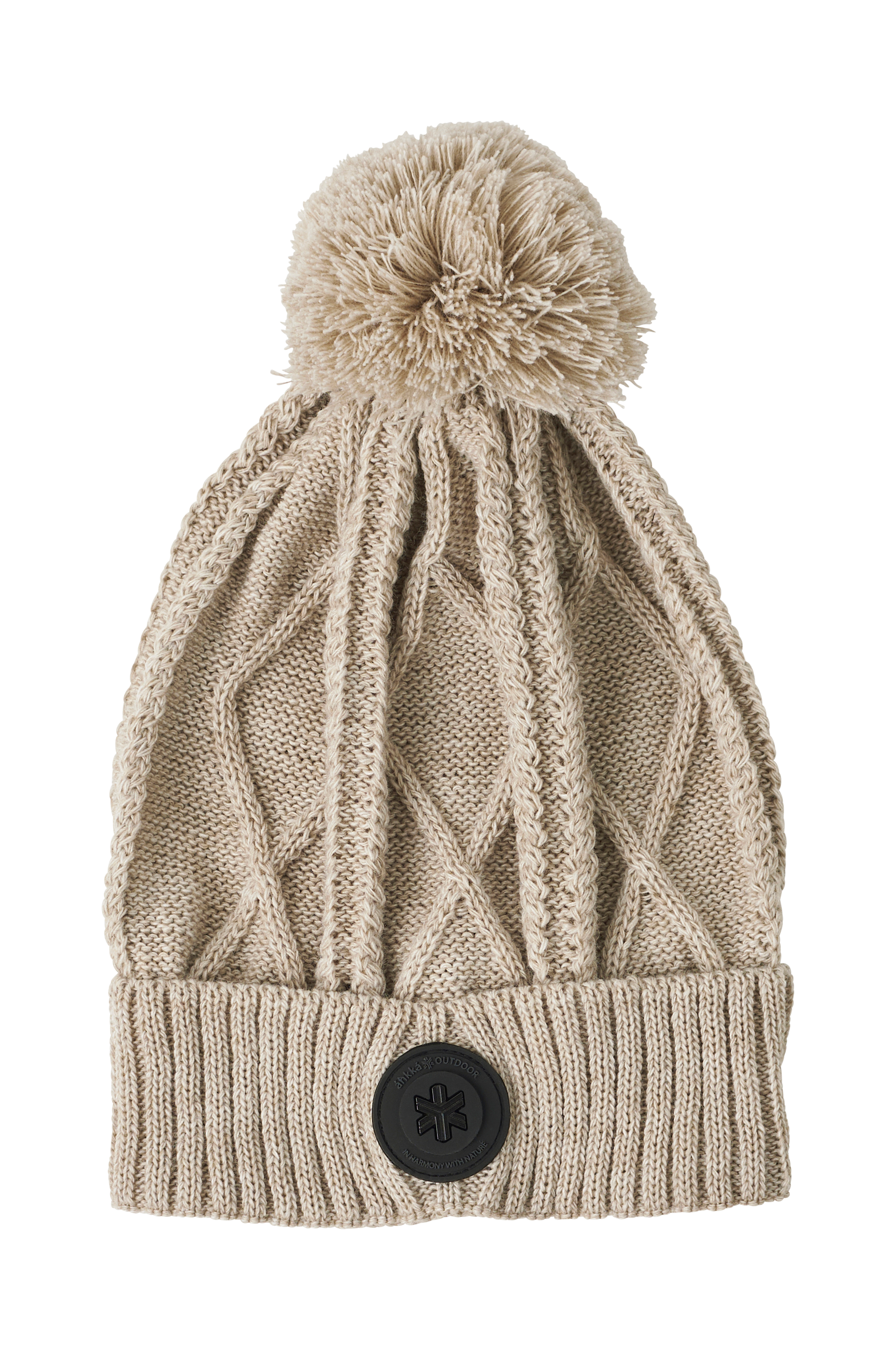 Kabelstrikket hue fra Áhkká med en blød og lodden kvast. Ribstikket kant forneden med opslag med gummieret logo.