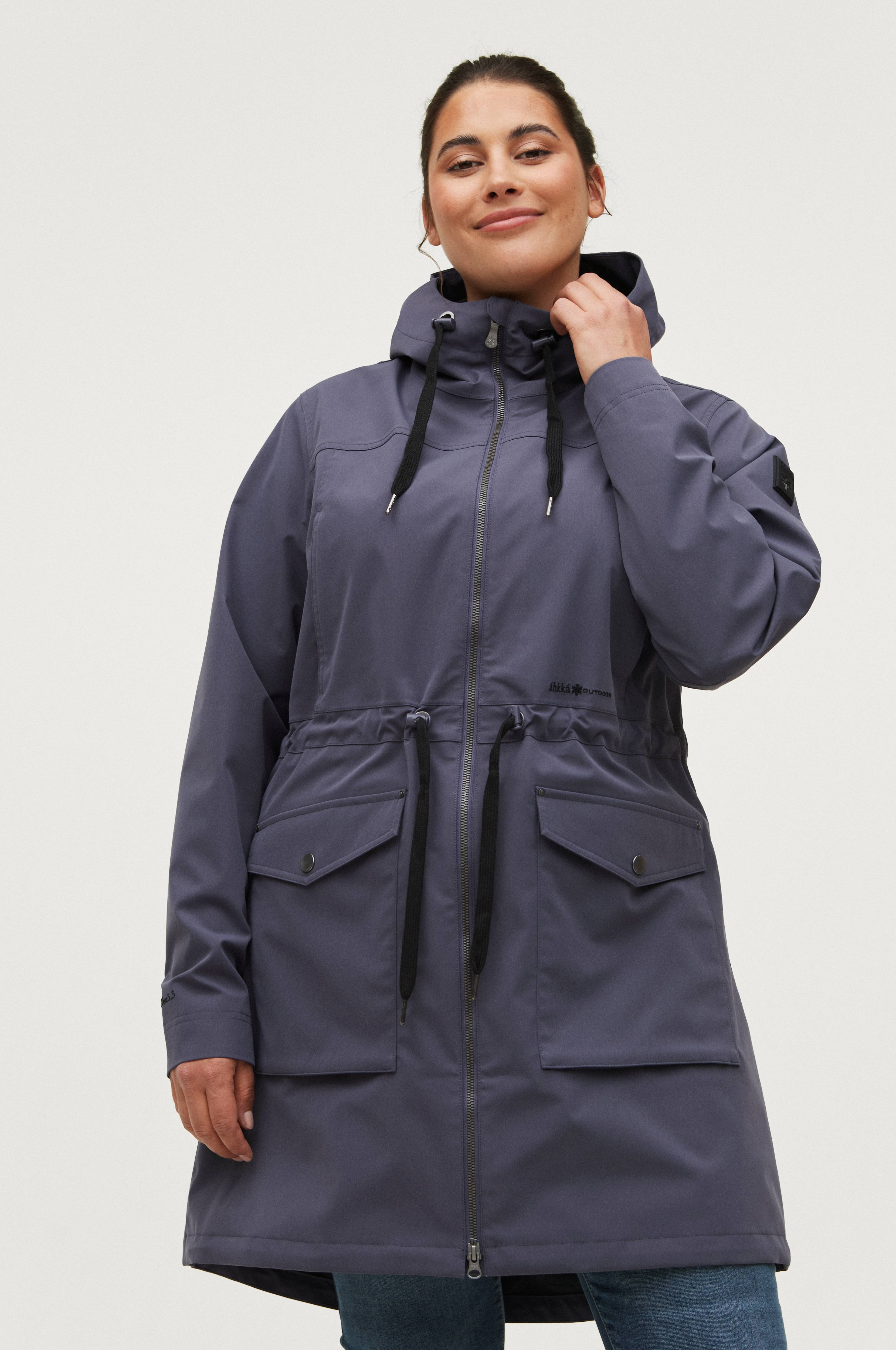 En uvatteret parkacoat fra Áhkká i flot streetlook. Vind- og vandtæt yderstof áphiTec 5.5 i bomuldsblanding, 5000 mm vandsøjletryk og åndbarhed op til 5000 g/m2/24h. Fast hætte med løbegang. 2-vejslynlås. Løbegang med stop i taljen og kanten forneden. Regulerbar vidde i ærmekant med trykknap. To lommer forneden med klap, der kan knappes og to brystlommer med skjult lynlås. En inderlomme med lynlås. Længde ca. 94 cm i str. 36.