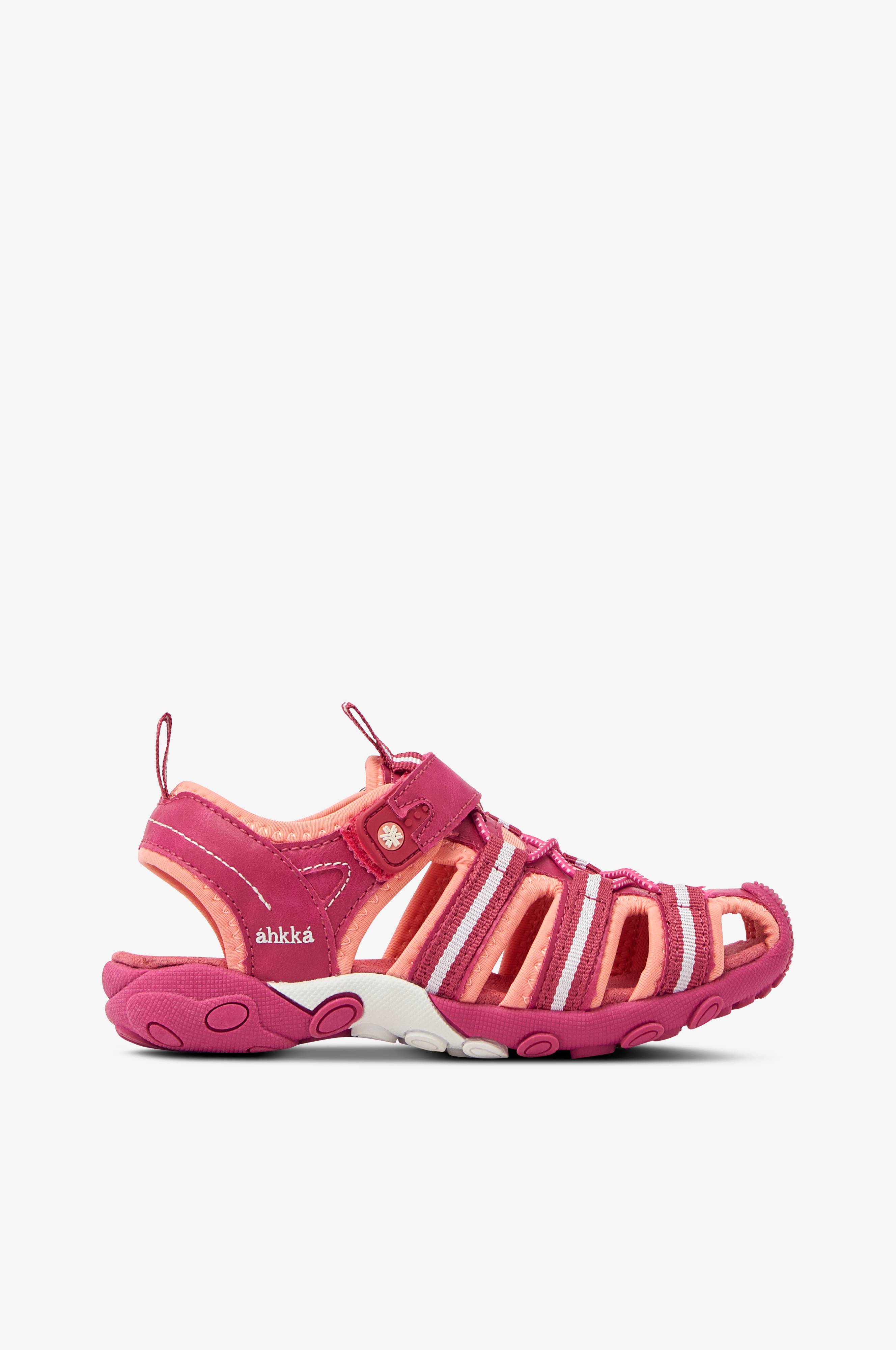 Sandaler fra Ahkka i behagelig og sporty model med lukket og forstærket tå som beskytter. Blød fodseng. Elastisk quicksnøre og velcrorem over vristen som regulerer pasformen perfekt. Vævede stropper på pløsen og bagpå. Robust, grebssikker ydersål.