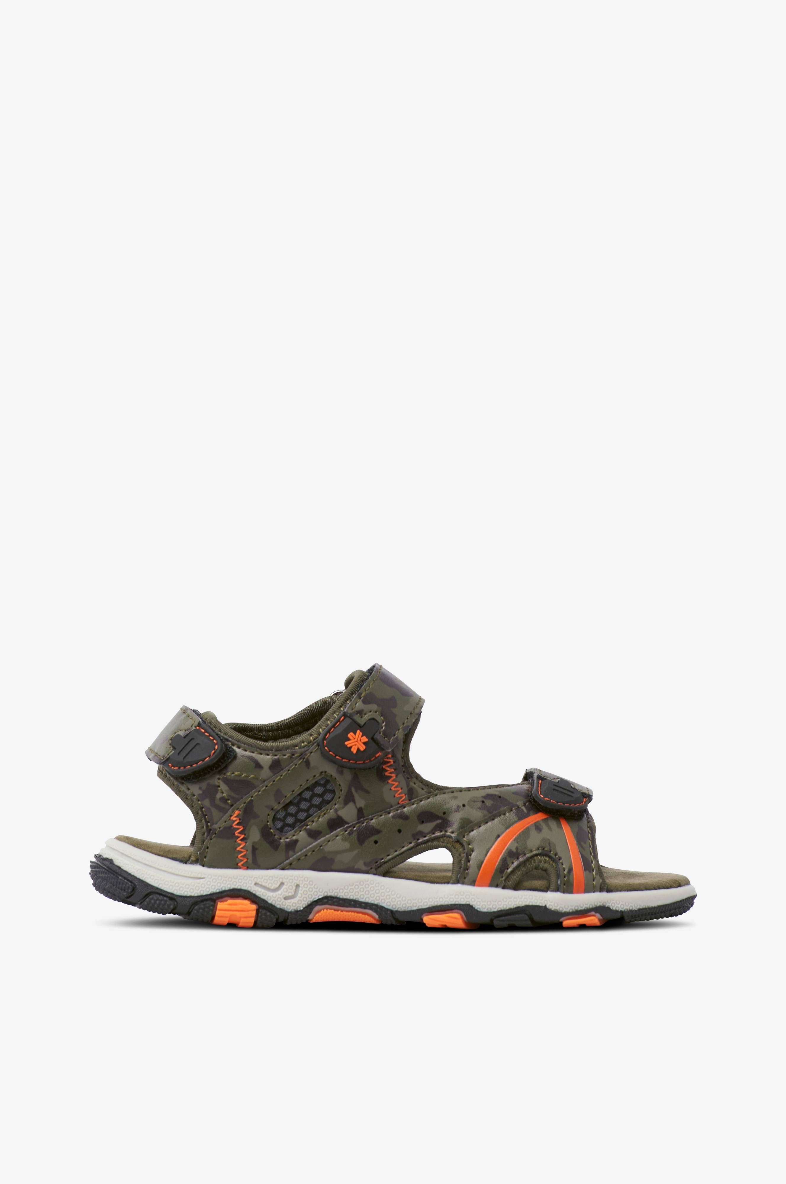 Sporty sandal fra Áhkká i camouflagemønstret imiteret skind med let vatterede remme med tekstilfor. De tre remme justeres med velcro for perfekt pasform. Stofbeklædt fodseng og ydersål med godt greb.