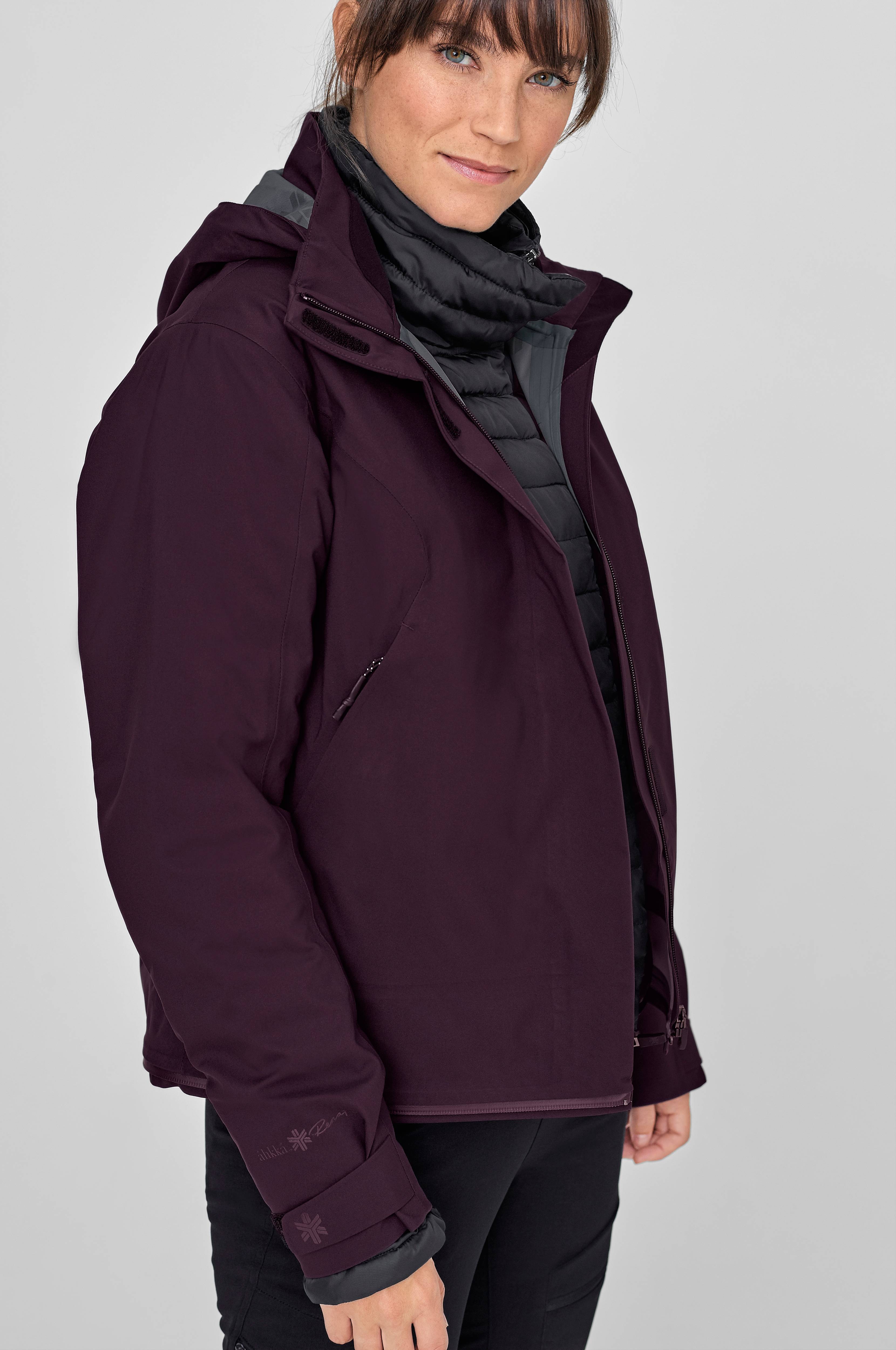 Aftagelig hætte med elastisk løbegang og stop. Høj krave med børstet polyester på indersiden. Lukning med lynlås og beskyttende overfald med velcrolukning. Ergonomisk forbøjede ærmer og justerbar ærmekant med velcroremme. Underdelen er aftagelig med vandtæt lynlås rundt om. To lommer med lynlås. Som lang parkacoat kan den også justeres i kanten forneden med løbegang og stop. Totallængde ca. 97 cm i str. M, med aftagelig nederdel ca. 64 cm i str. M.