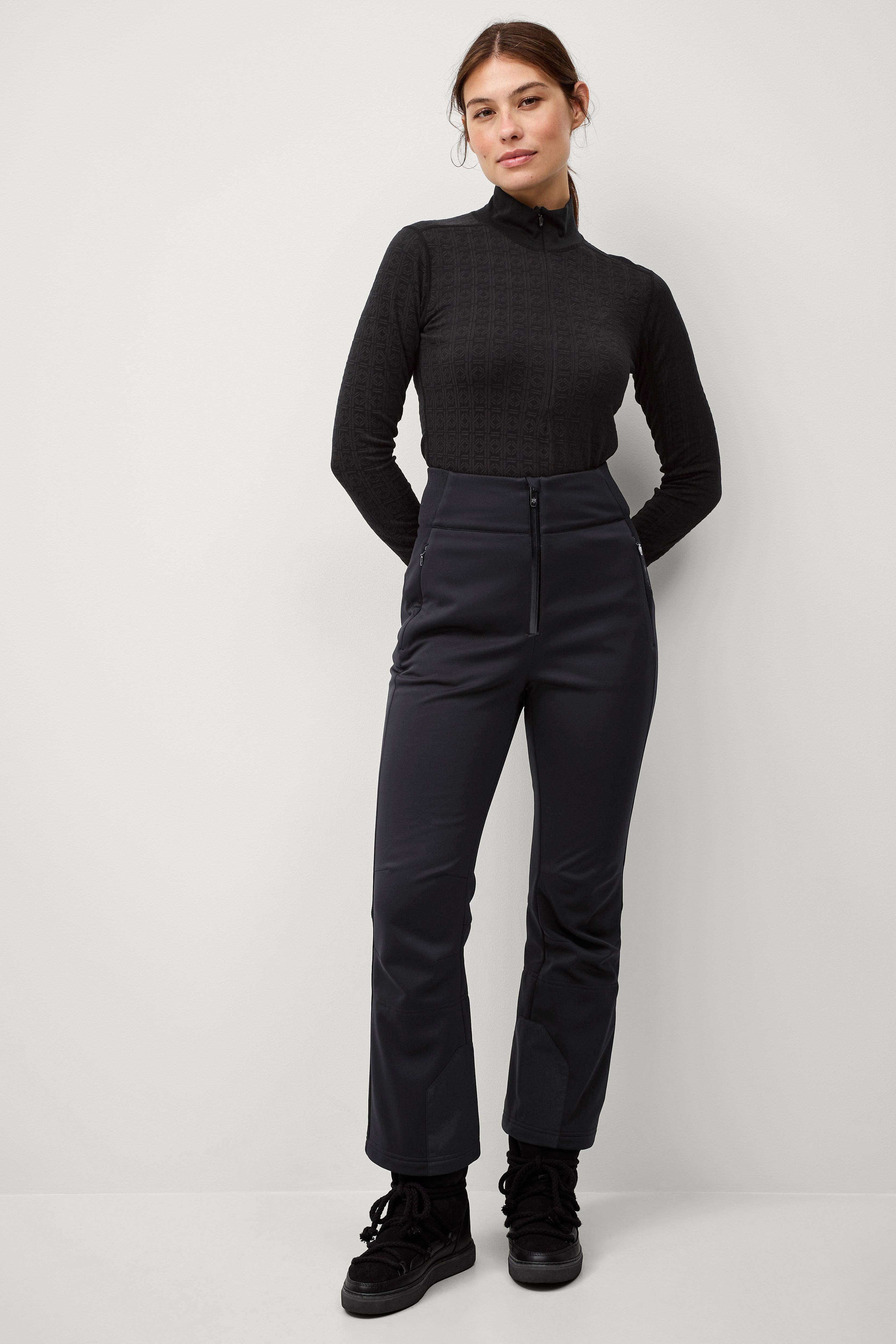 Skibukser i elastisk softshell med en slankere silhuet. Blød fleece på indersiden. Vind- og vandtæt stof 3K/3K.Lynlåse ved benafslutningerne med kiler bagved for at gøre det lettere at tage støvlerne af og på.