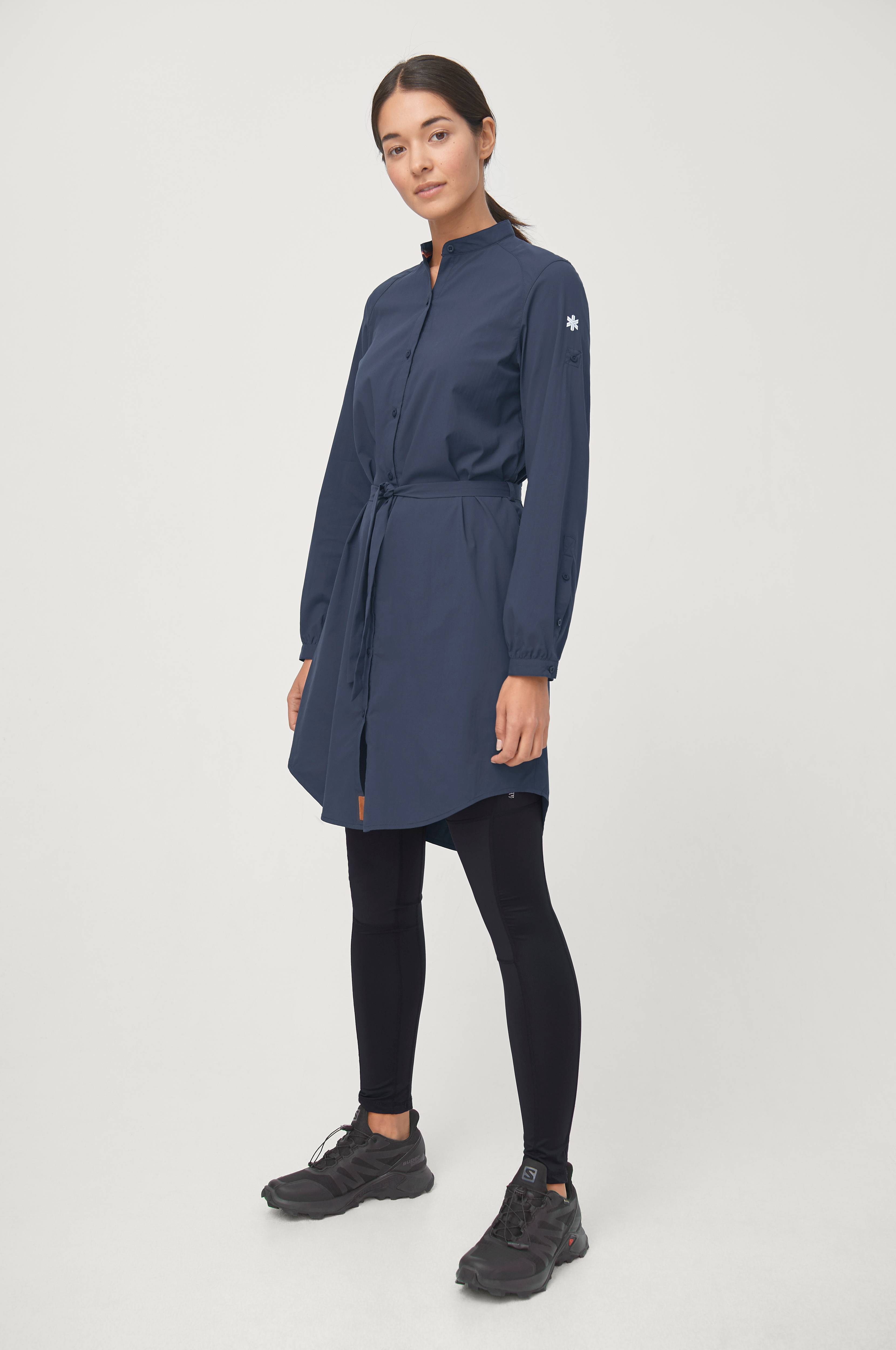 Vævet, let skjortekjole fra kollektionen Áhkká by Renata i hurtigtørrende kvalitet med mekanisk stretch for bedste bevægelsesfrihed. Perfekt sammen med et par trekkingtights på vandreturen, men fungerer også godt en dag i byen eller når du tager til stranden. Gennemknappet model med rund krave. Langt ærme som kan rulles op og fastgøres med knaptamp. Aftageligt bindebælte i taljen. To skjulte lommer i sidesømmene med lynlås. Noget længere bagpå med afrundet kant forneden. Længde bagpå ca. 99 cm i str. M.