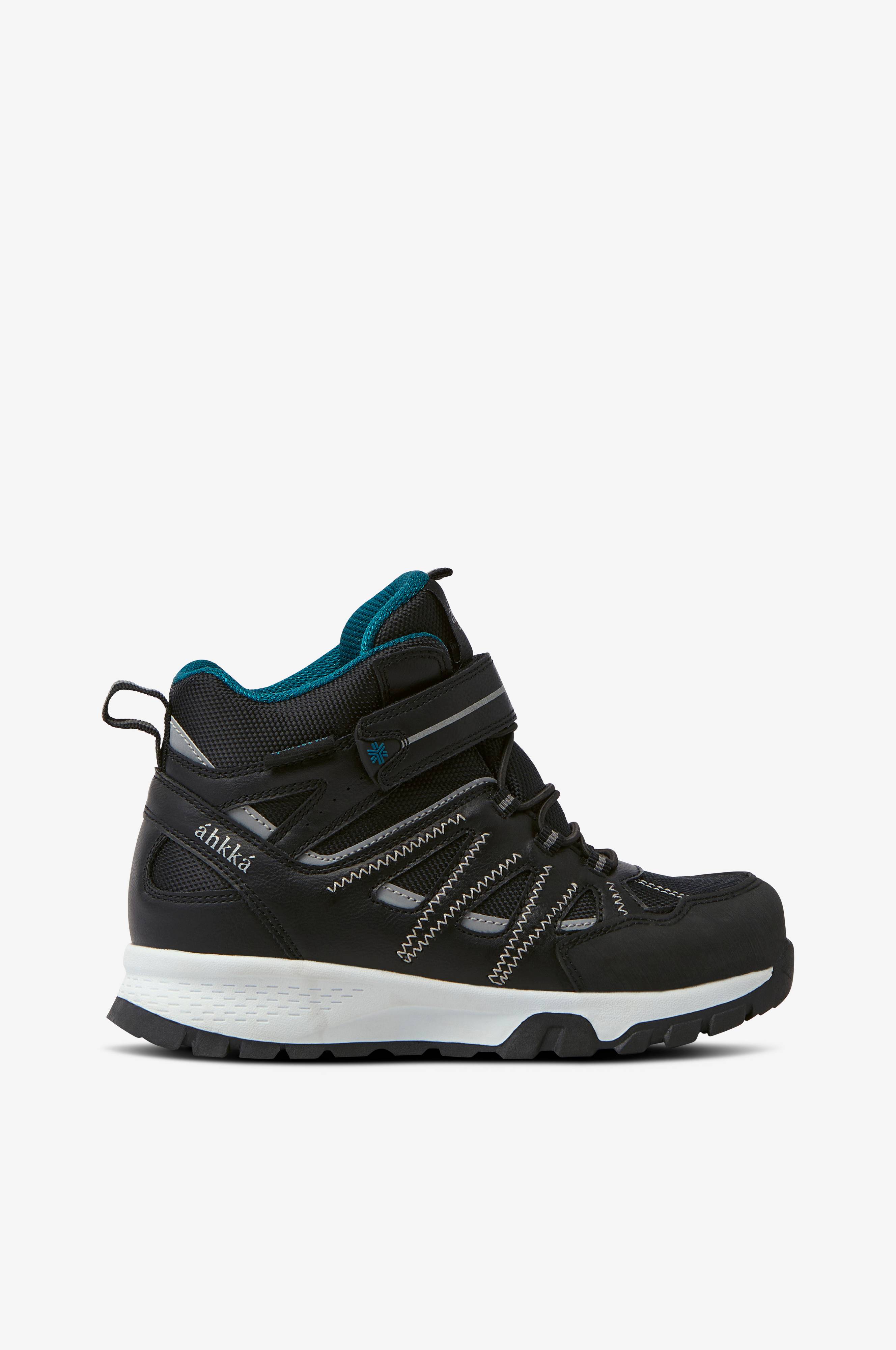 Høje, vandtætte sneakers fra Áhkká i tekstil og syntet med refleksdetaljer på hælen og i siderne. Gummiforstærket tå for øget slidstyrke. For i blød fleece. Elastisk quicksnøre og en velcrorem som justerer pasformen perfekt. Vatteret skaft og pløs. Vævede stropper på pløsen og bag på skaftet. Udtagelig indersål. Ydersål med godt greb.