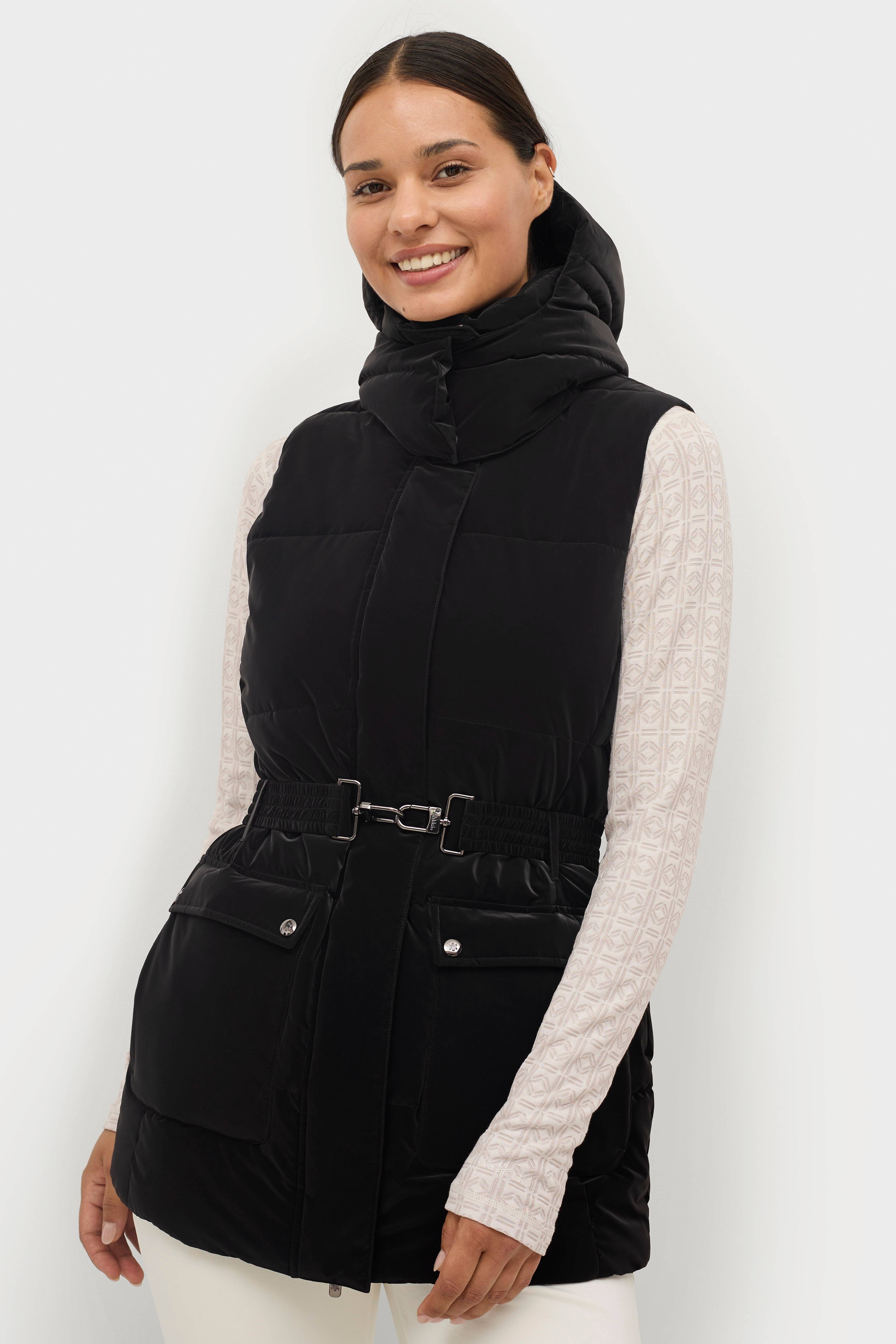 Vatteret vest i figursyet, noget længere model med vind- og vandafvisende yderstof og en luksuriøs, velourlignende overflade.