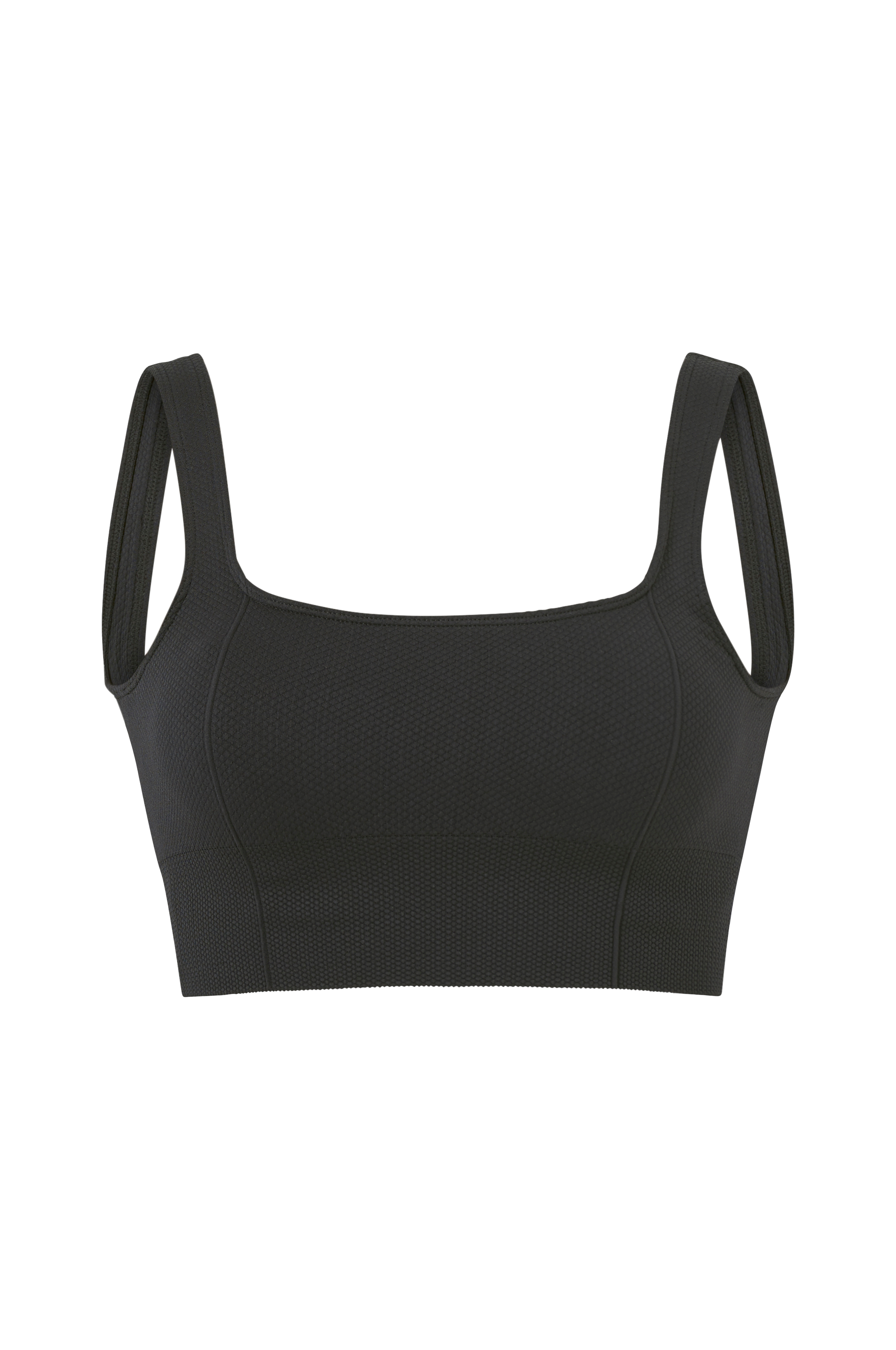 Behagelig sports-bh som giver let støtte med flotte detaljer og en elegant seamless-struktur i stoffet. Formpressede, udtagelige skåle. Lille logo i metal bagpå.
