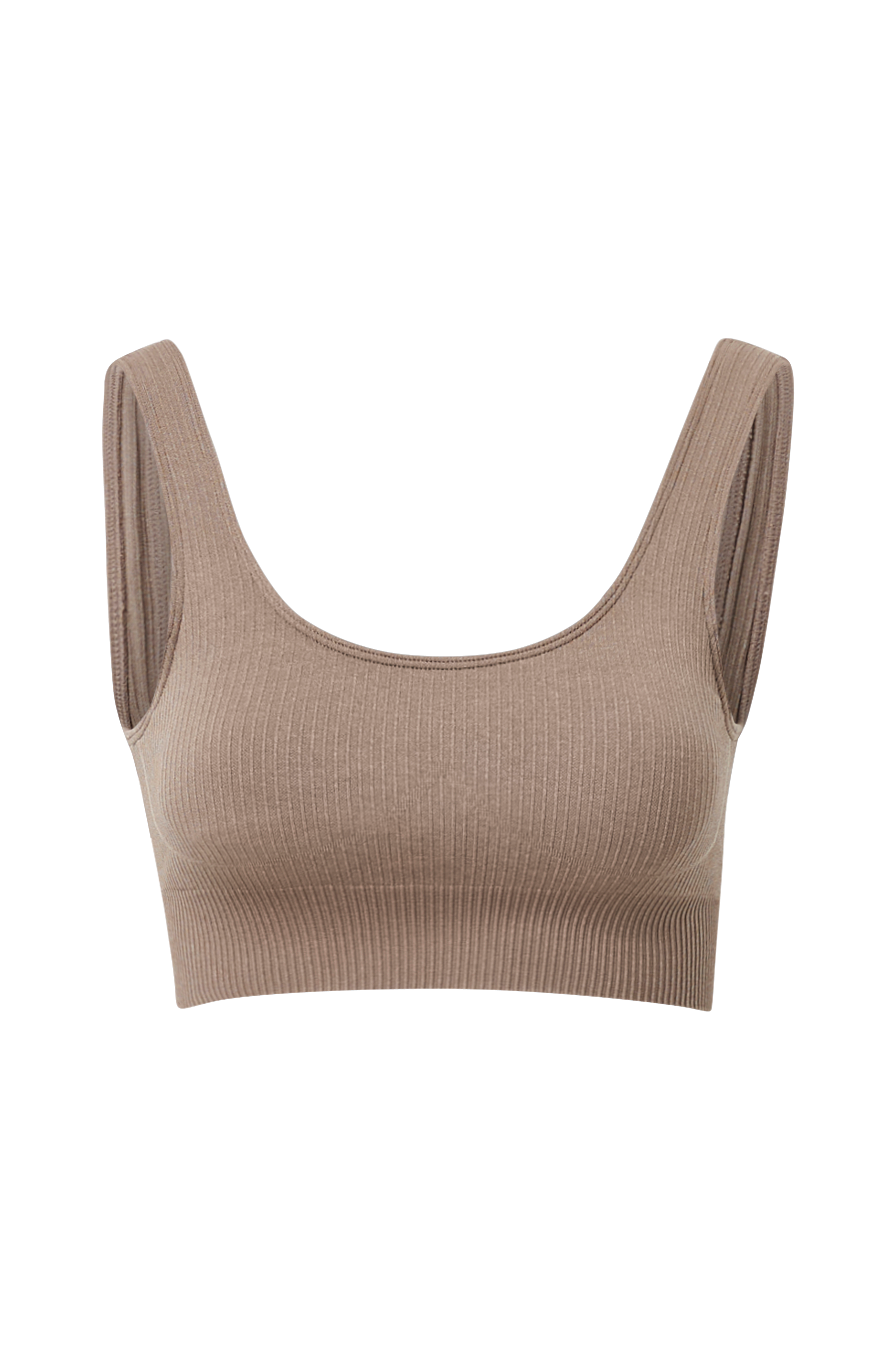 Sports-bh Espresso Ribbed Seamless Bra fra Aim'n i et blødt, åndbart stof og sidder skønt mod huden, med et enkelt og moderne design, der kan bruges både i og udenfor træningscentret. Fremstillet i fleksibelt 4-vejs ribstrikket stof som følger kroppens bevægelser.