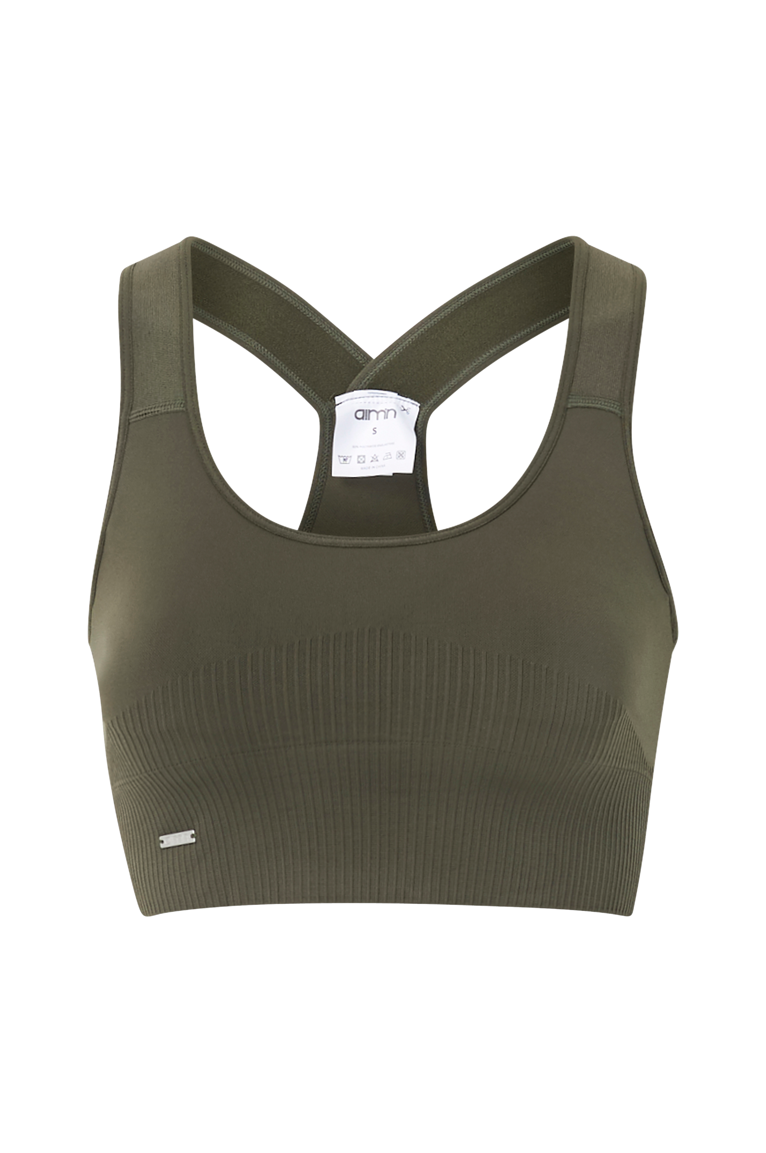 Sports-bh Khaki High Support Ribbed Bra fra Aim'n støtter dig og giver en sikker og behagelig følelse. Bryderryggen med stretch giver strategisk støtte og er tilpasset high-support aktiviteter. Sømløst stof med fugtafledende egenskaber. Skåle med udtagelig vattering.