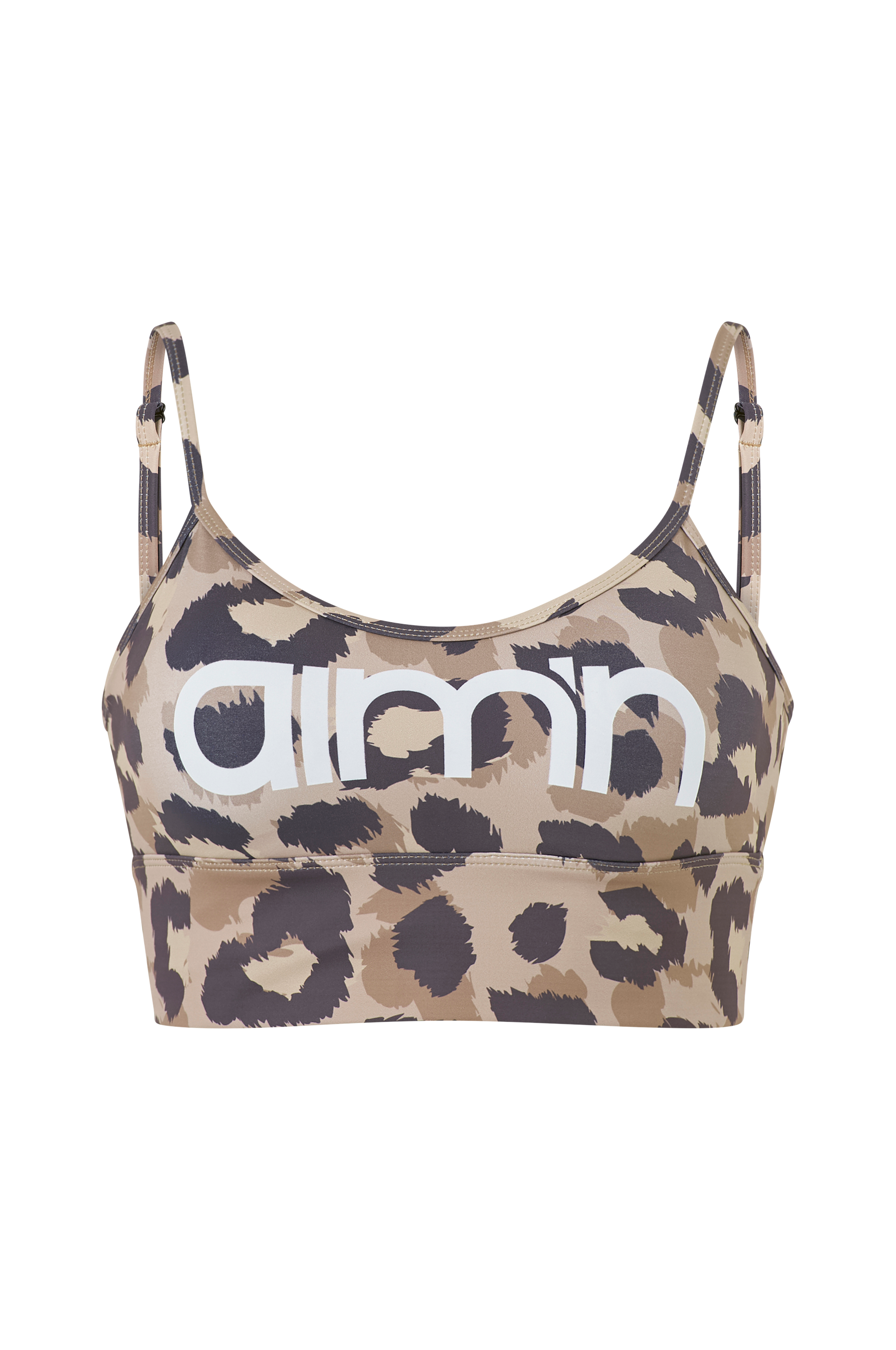 Leopardmønstret sports-bh i figursyet model af fugtafledende stretchmateriale. Model med kraftig støtte. Formpressede udtagelige skåle. Justerbare skulderstropper.
