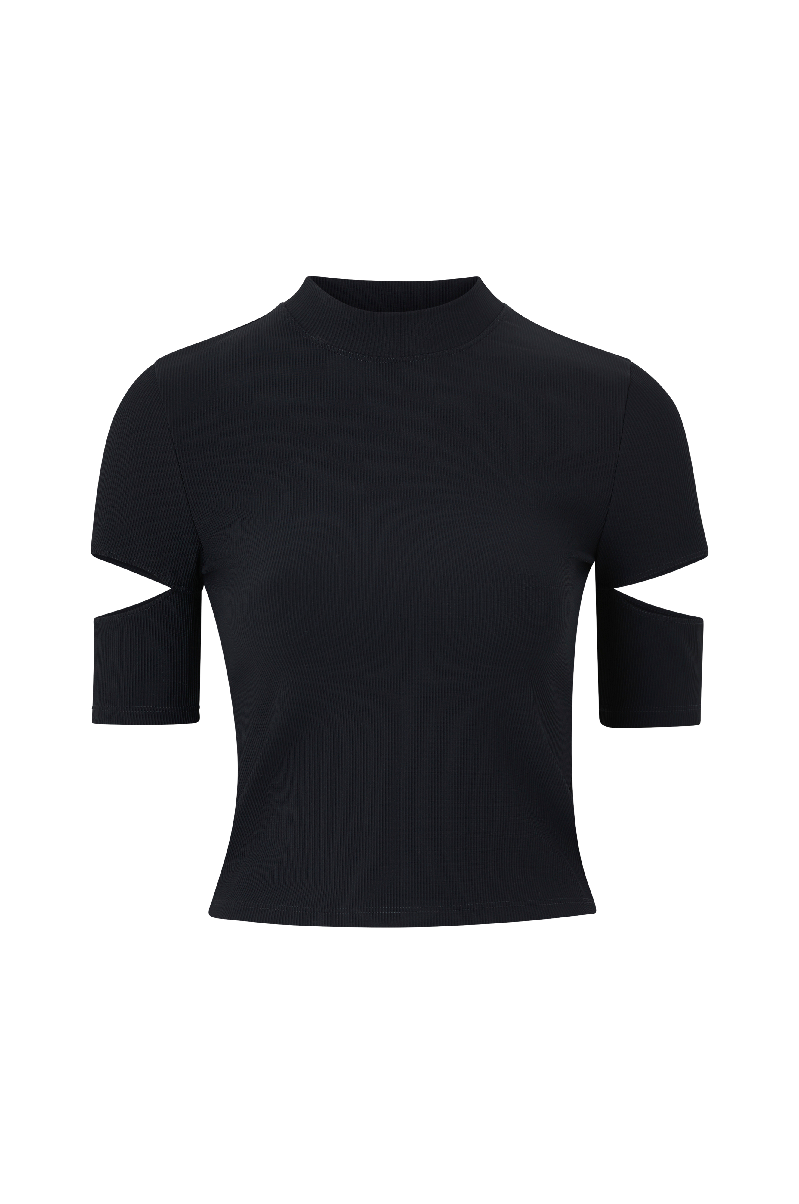 • Top i ribbet, elastisk jersey• Høj, rund halsudskæring• Kort ærme med afskårede detaljer