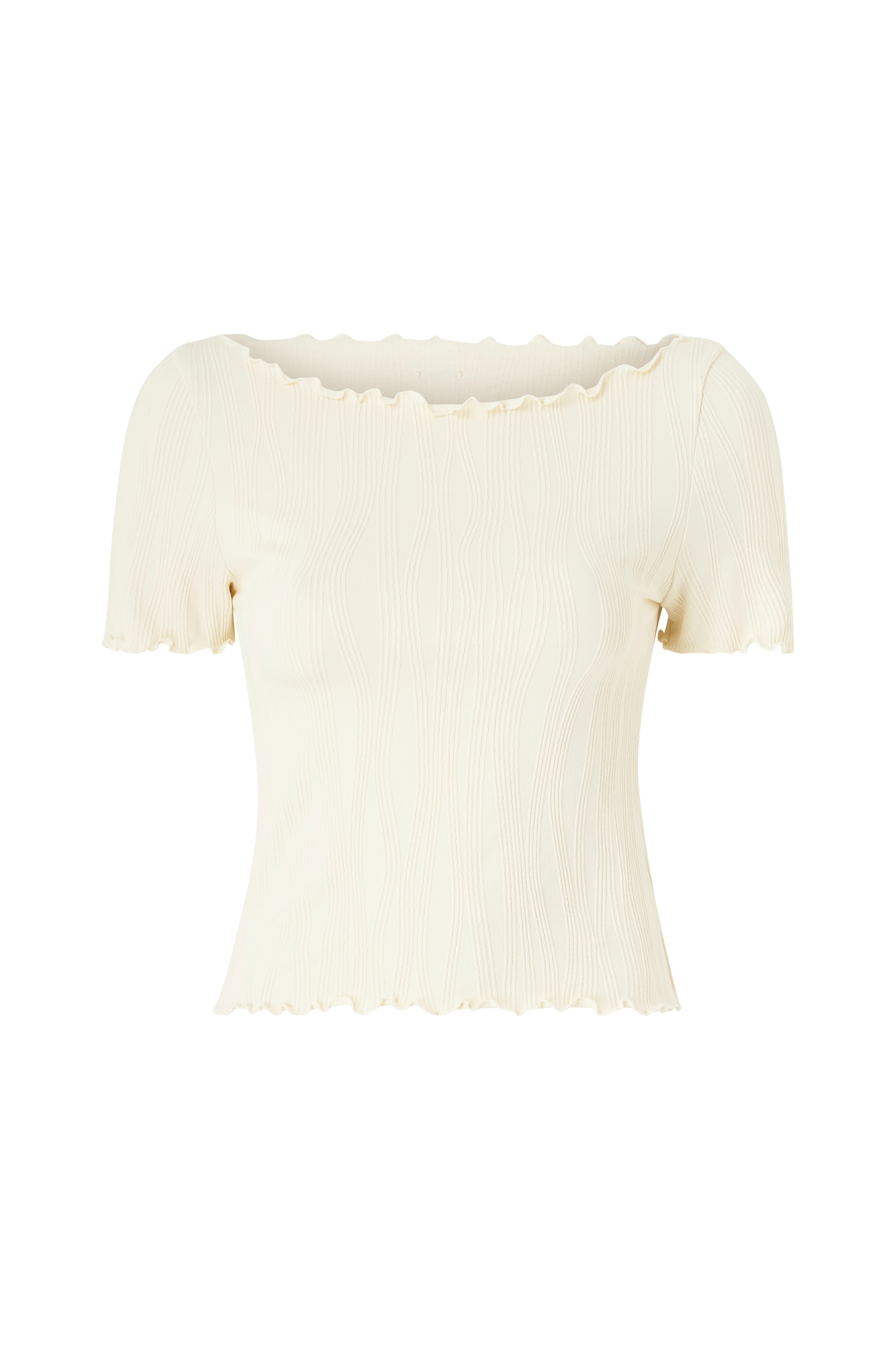 • Kortærmet top med smal pasform• Rund, bred halsudskæring• Korte ærmer• Elastisk materiale med ribbet struktur• Bølgede kanter rundt om halsen, ved ærmeafslutningerne og nederst