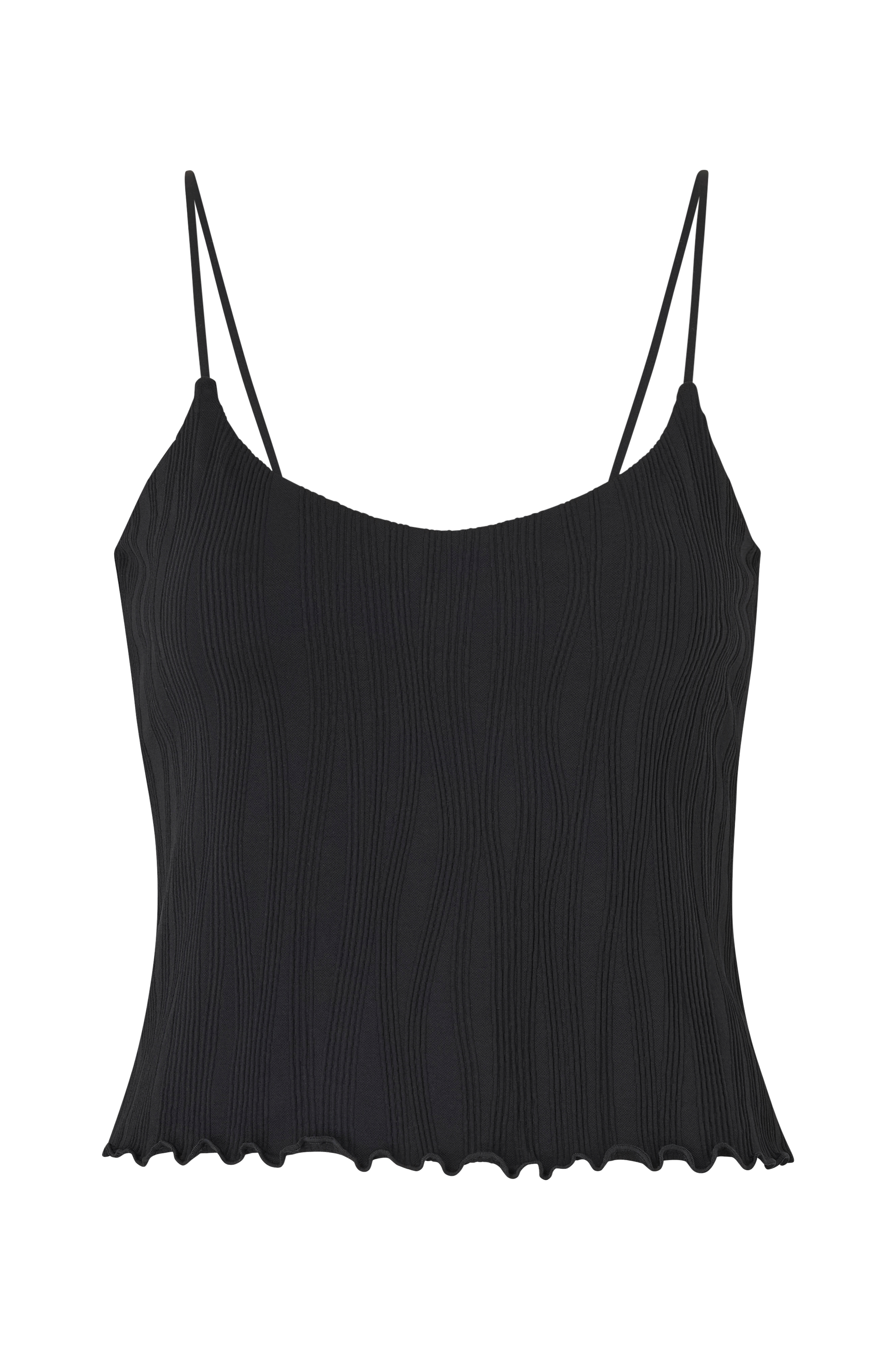 • Ærmeløs, foret top• Elastisk materiale med ribbet struktur• Spaghettistrop• Bølget søm