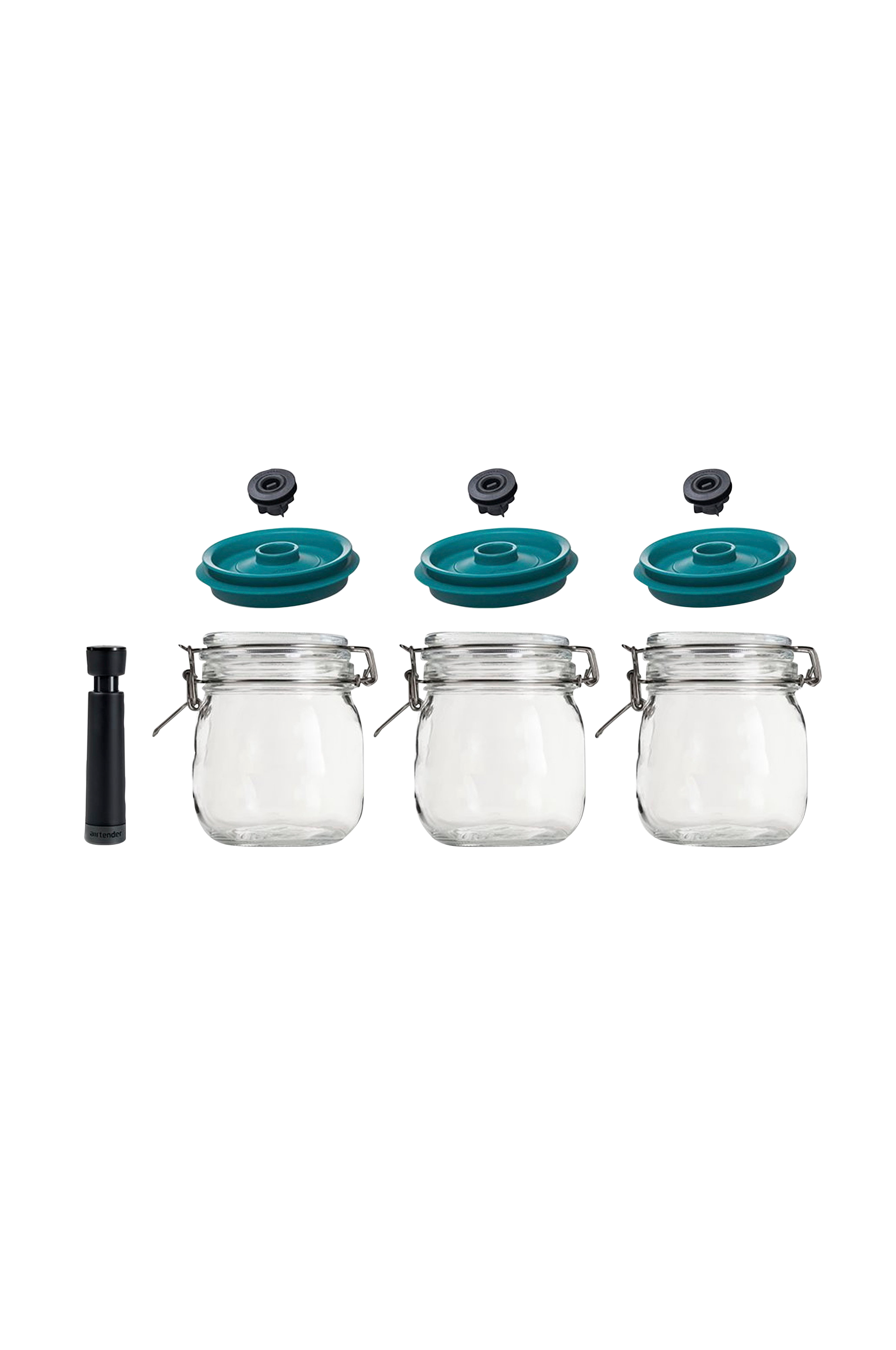 Dette sæt indeholder en vakuumpumpe, 3 låg og propper og 3 klassiske 1-liters weck-dåser. 5 x længere frisk under vakuum, det er bevist, at maden holder sig frisk og fuld af smag op til 5 gange(!) længere. Det er betydeligt længere end blot at opbevare i et lufttæt glas. Især hvis glasset åbnes ofte, er effekten af lufttæt opbevaring minimal. weck-krukker bruges også ofte til fermentering og infusion. For eksempel i produktionen af kimchi eller kombucha (fermenteret te). Både infusion og fermentering går hurtigere og bedre med vakuum. Takket være vakuummet kan man infundere på få minutter i stedet for timer eller dage. Fermentering kommer kun i gang i et iltfattigt miljø, så vakuum er den ideelle start for det. Selvfølgelig kan indsætning, også kendt som wecking, også gøres nemt med airtender-vakuumlåget. Efter åbning holder vakuumlåget også indholdet frisk i længere tid!