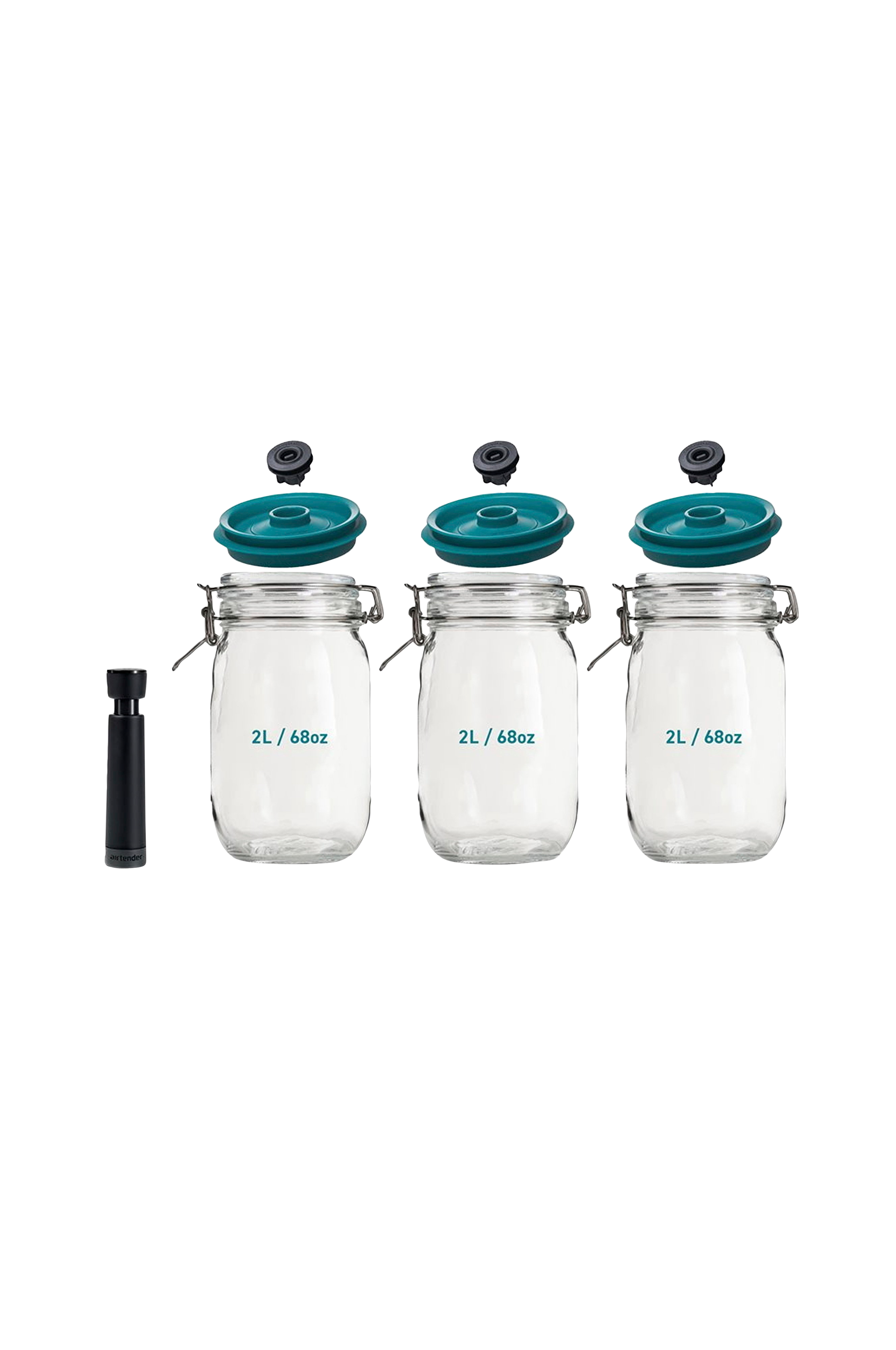 Dette sæt indeholder en vakuumpumpe, 3 låg og propper og 3 klassiske 2-liters weck-dåser. 5 x længere frisk under vakuum, det er bevist, at maden holder sig frisk og fuld af smag op til 5 gange(!) længere. Det er betydeligt længere end blot at opbevare i et lufttæt glas. Især hvis glasset åbnes ofte, er effekten af lufttæt opbevaring minimal. weck-krukker bruges også ofte til fermentering og infusion. For eksempel i produktionen af kimchi eller kombucha (fermenteret te). Både infusion og fermentering går hurtigere og bedre med vakuum. Takket være vakuummet kan man infundere på få minutter i stedet for timer eller dage. Fermentering kommer kun i gang i et iltfattigt miljø, så vakuum er den ideelle start for det. Selvfølgelig kan indsætning, også kendt som wecking, også gøres nemt med airtender-vakuumlåget. Efter åbning holder vakuumlåget også indholdet frisk i længere tid!