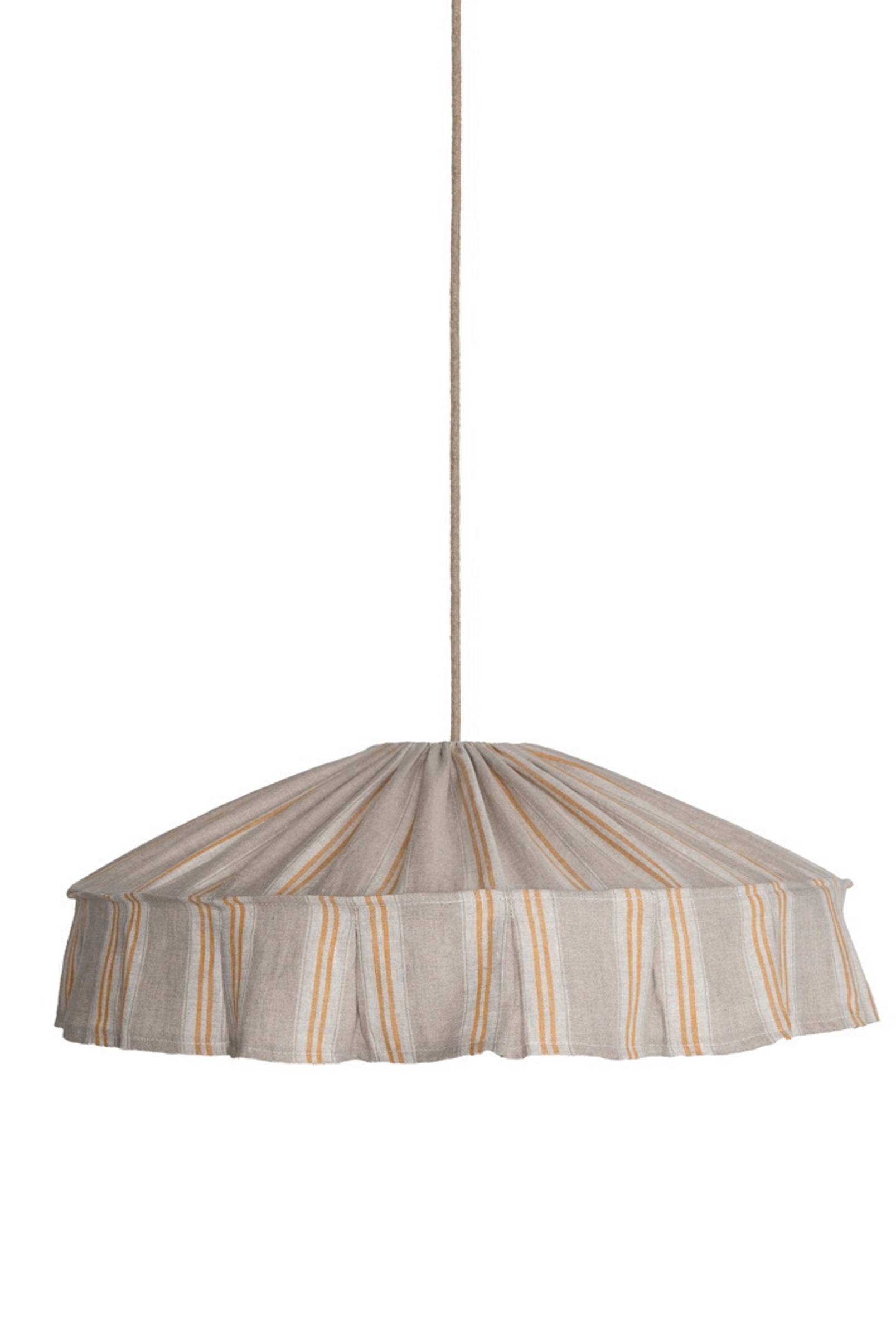 En loftslampeskærm af 100 % hør med vævede striber. Lampeskærmens flæser er fint forarbejdet med lagt modfold. Metalstellet er lakeret i matchende farve. Ledning/ophæng medfølger ikke og kan suppleres med loftsstik 2249813 fra Alde & Lind, som fås i flere farver.