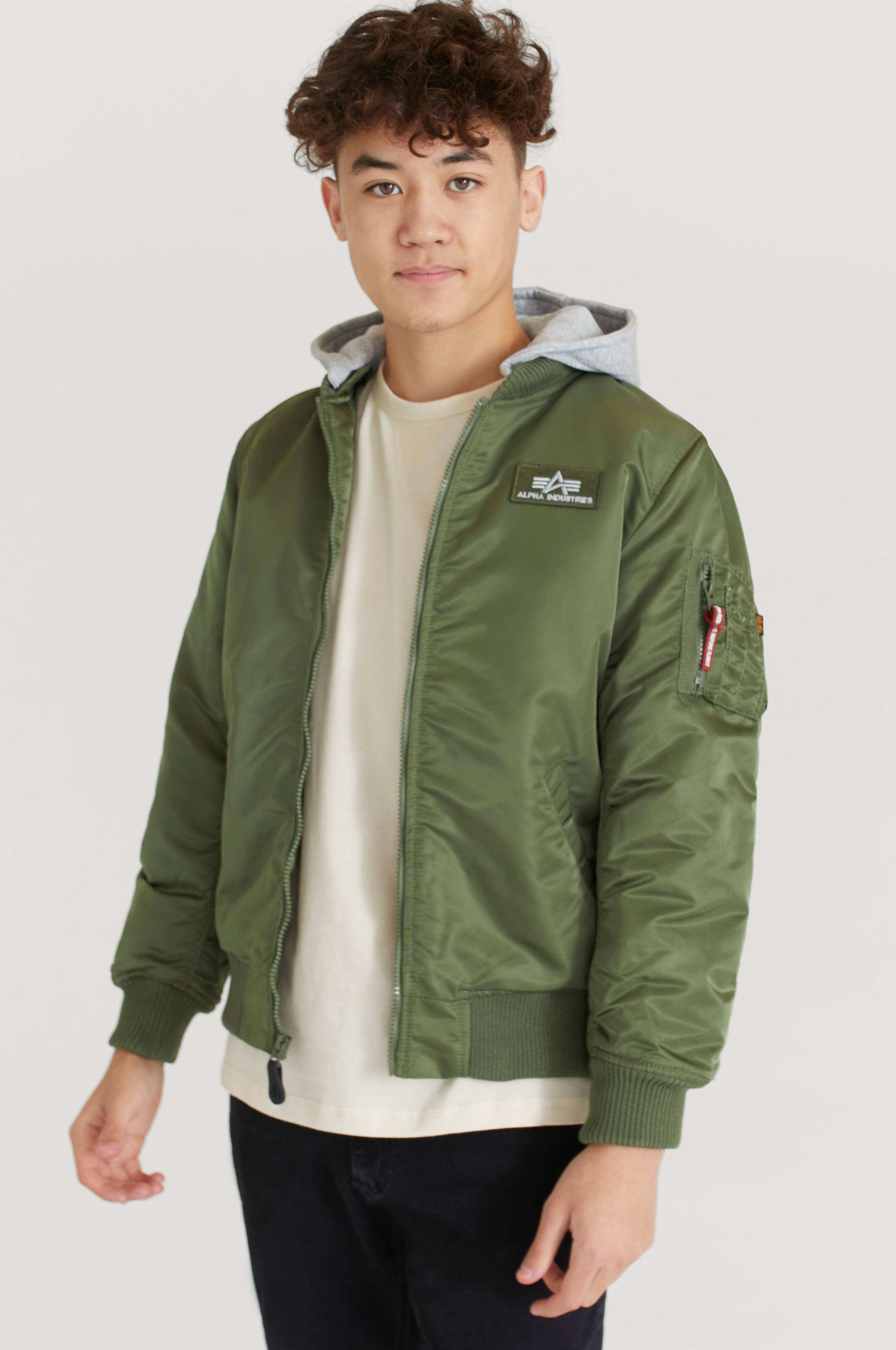 Bomberjakke fra Alpha Industries med aftagelig hætte. Jakken er varmt foret og har rib i kraven, ærmekanterne og kanten forneden. To sidelommer og en inderlomme. Lige snit forneden og logomærke på brystet.
