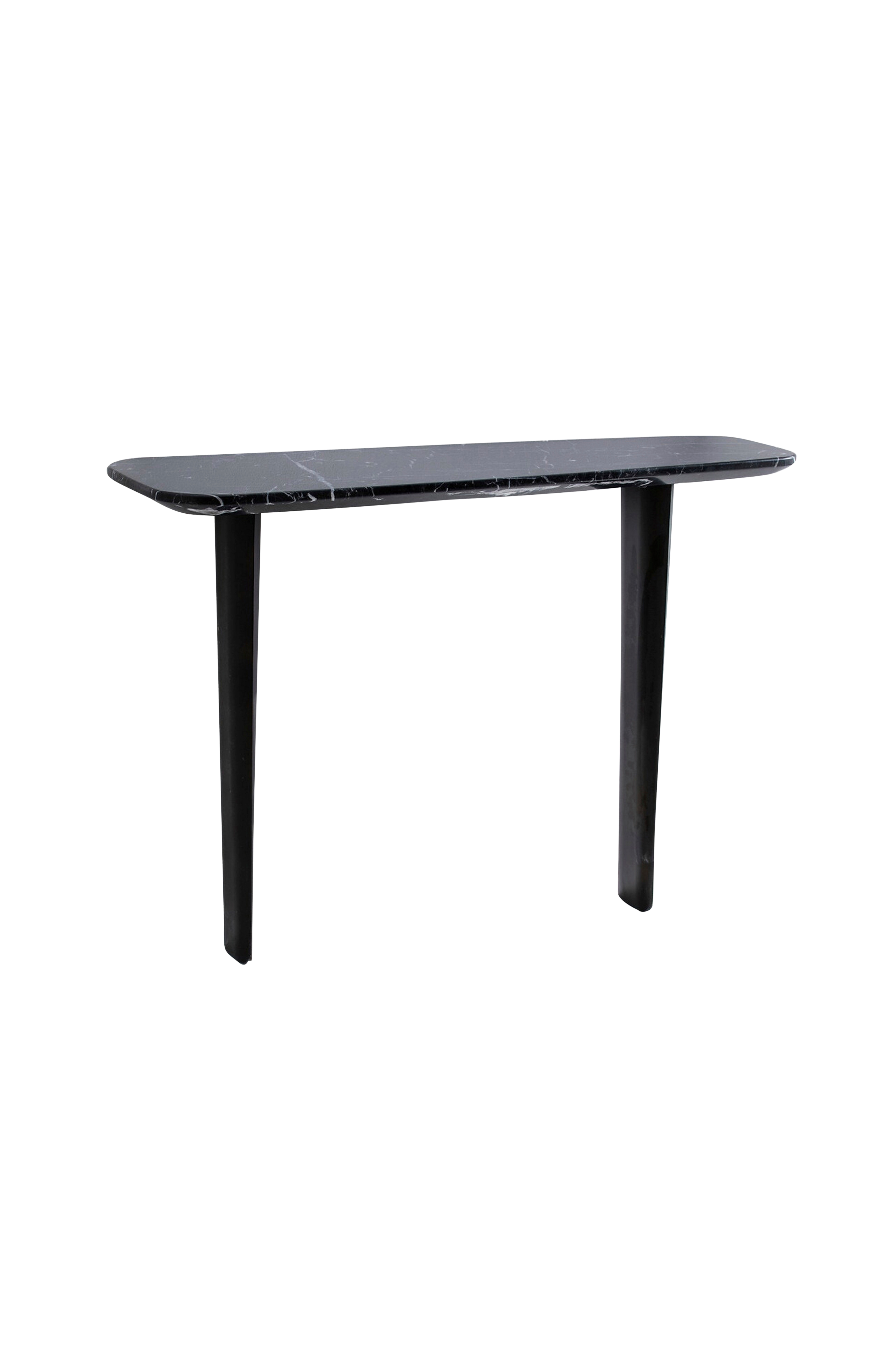 Dolmena aflastningsbord med affaset bordplade af marmor i organisk form. Originalt design med to epoximalede metalben med slidt effekt, formet som en flyvinge.