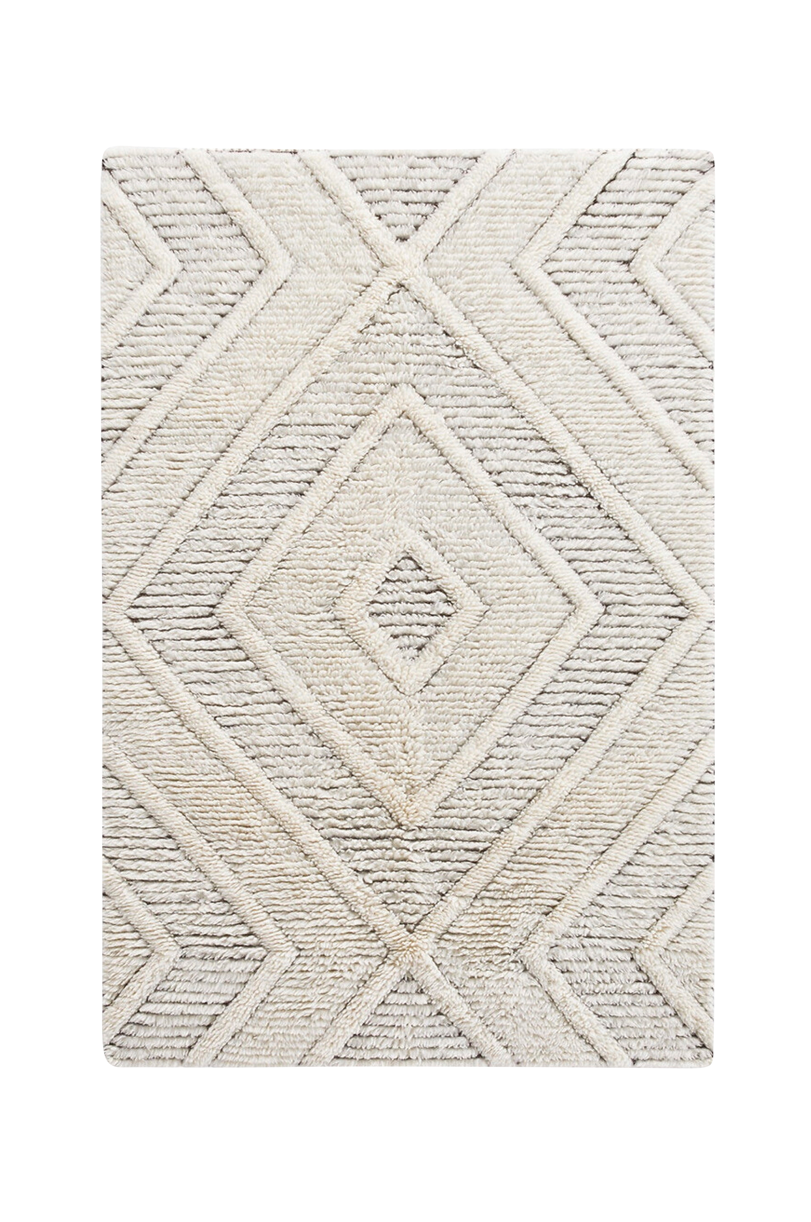 Nilou-tæppe i berberstil og med varmeisolerende og lydisolerende egenskaber. Smukt, etnisk og grafisk reliefmotiv, i bløde naturmaterialer. Gulvtæpper fra AM.PM er håndlavede og af høj kvalitet.