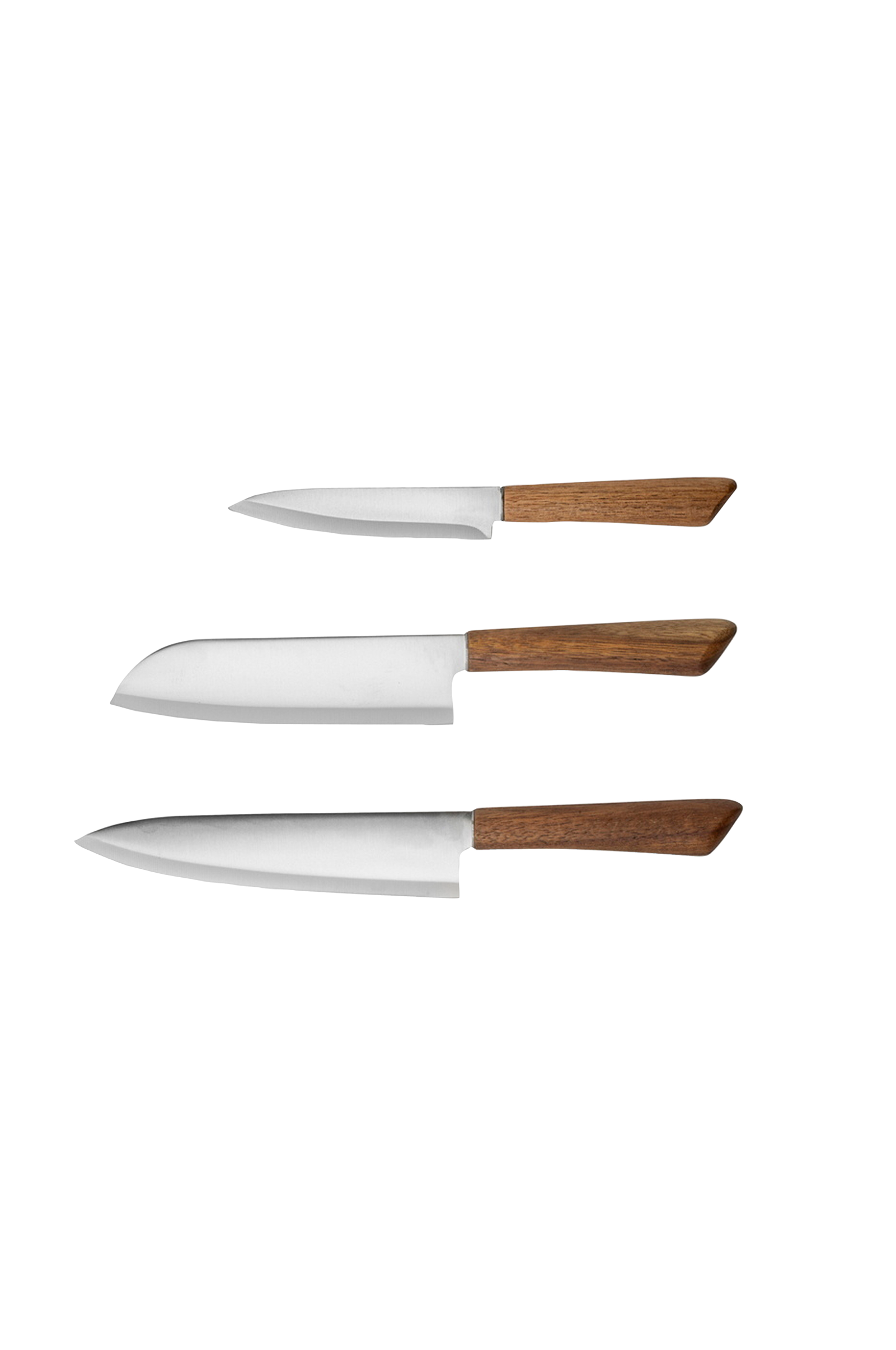 Sættet indeholder tre alsidige knive med slidstærke blade i rustfrit stål og fsc®-certificerede håndtag i akacietræ, som giver et behageligt og sikkert greb.