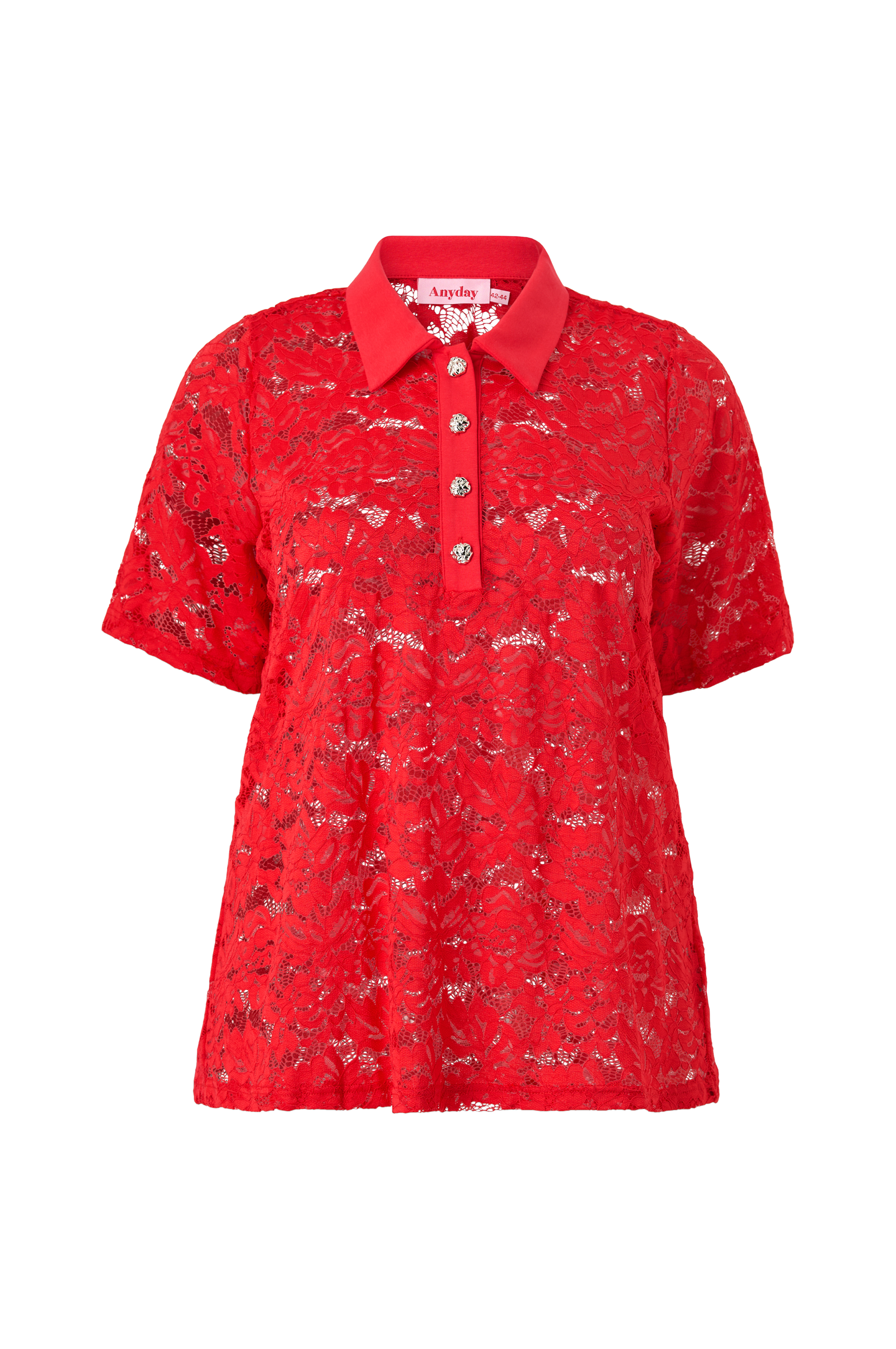 • Top i elastisk blonde• Krave i jersey• Irregulære knapper oppe foran• Korte ærmer• Plusstørrelser