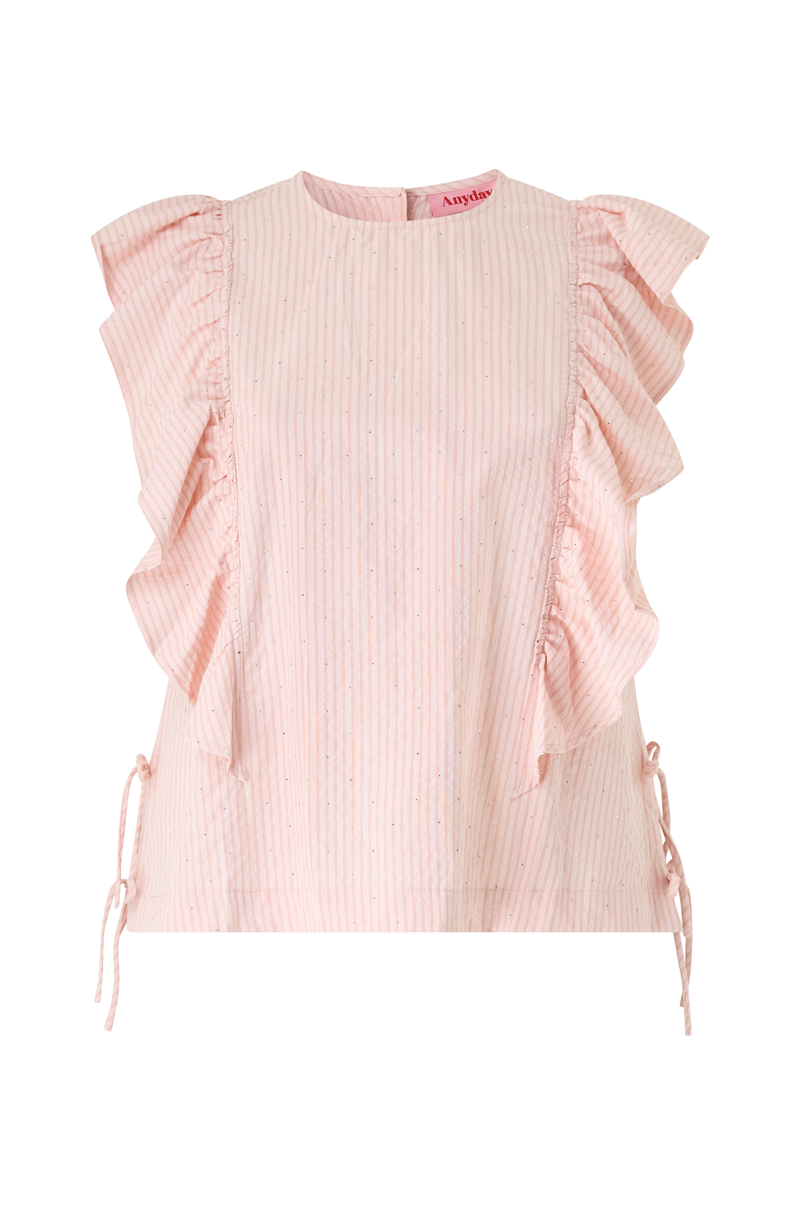 • Ærmeløs bluse i seersucker med funklende rhinstene• Rund halsudskæring med skjult knaplukning i nakken• Volanter over skuldrene• Slidser nede i siderne med dekorative knudedetaljer• Plusstørrelser