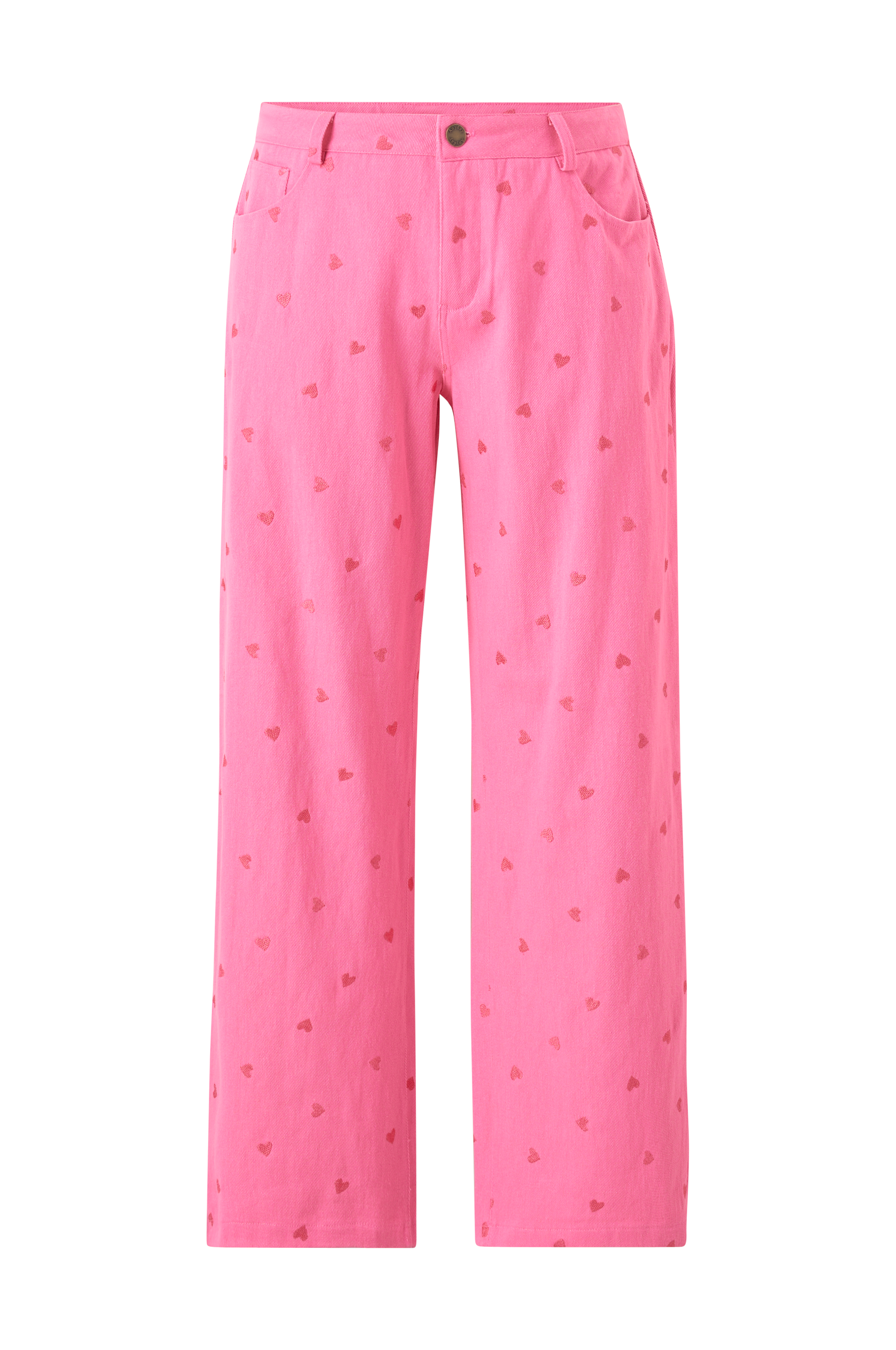 • Store størrelser• Femlommemodel med broderede hjerter overalt• Taljebånd med justérbart elastisk bånd på indersiden• Brede, lige ben• Indre benlængde: 81 cm i størrelse 42
