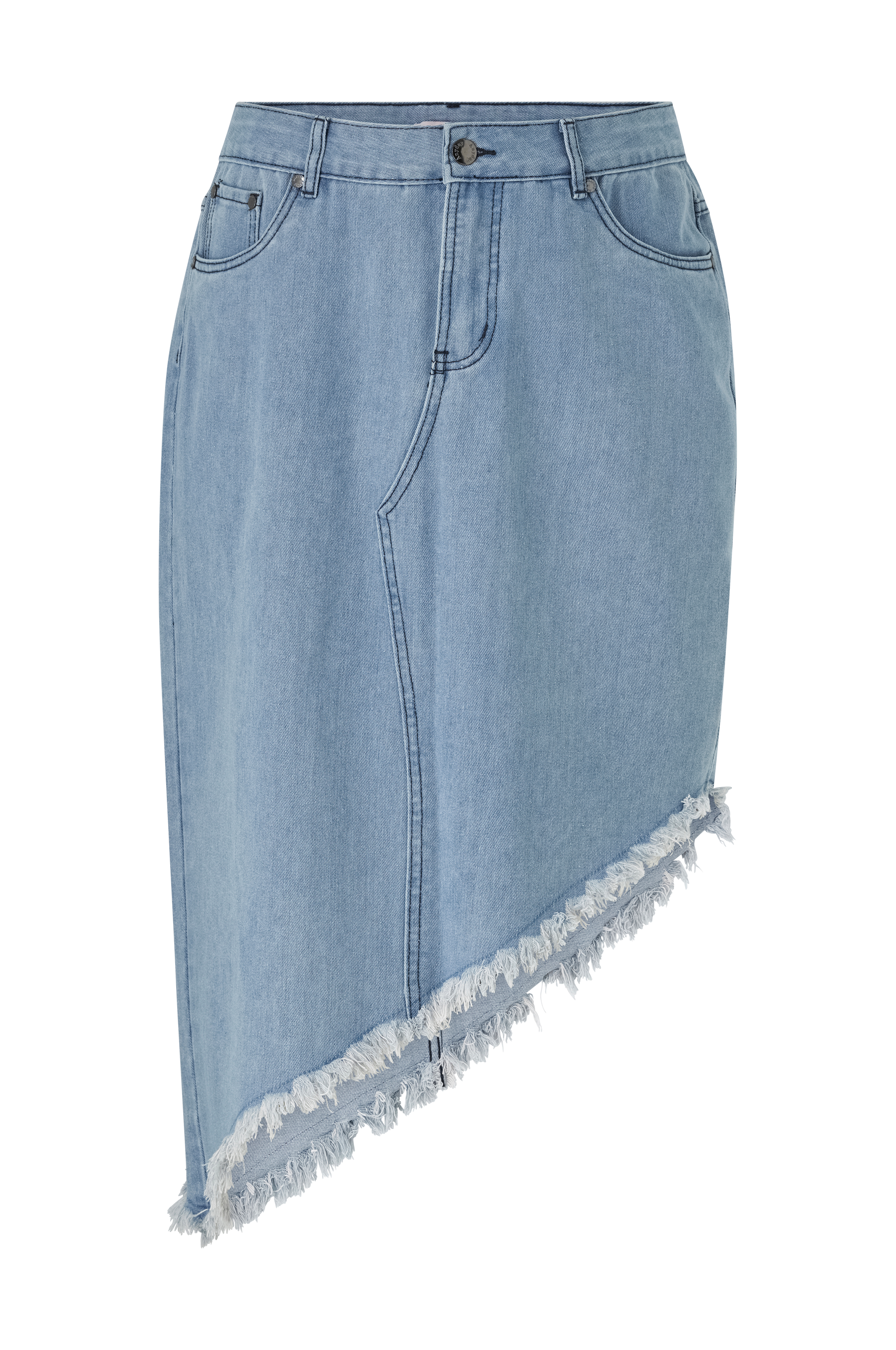 • Store størrelser• Femlommemodel med svaj• Linning med justérbar elastik indvendigt• Asymmetrisk søm med frynser• Længde: 51/83 cm i størrelse 42