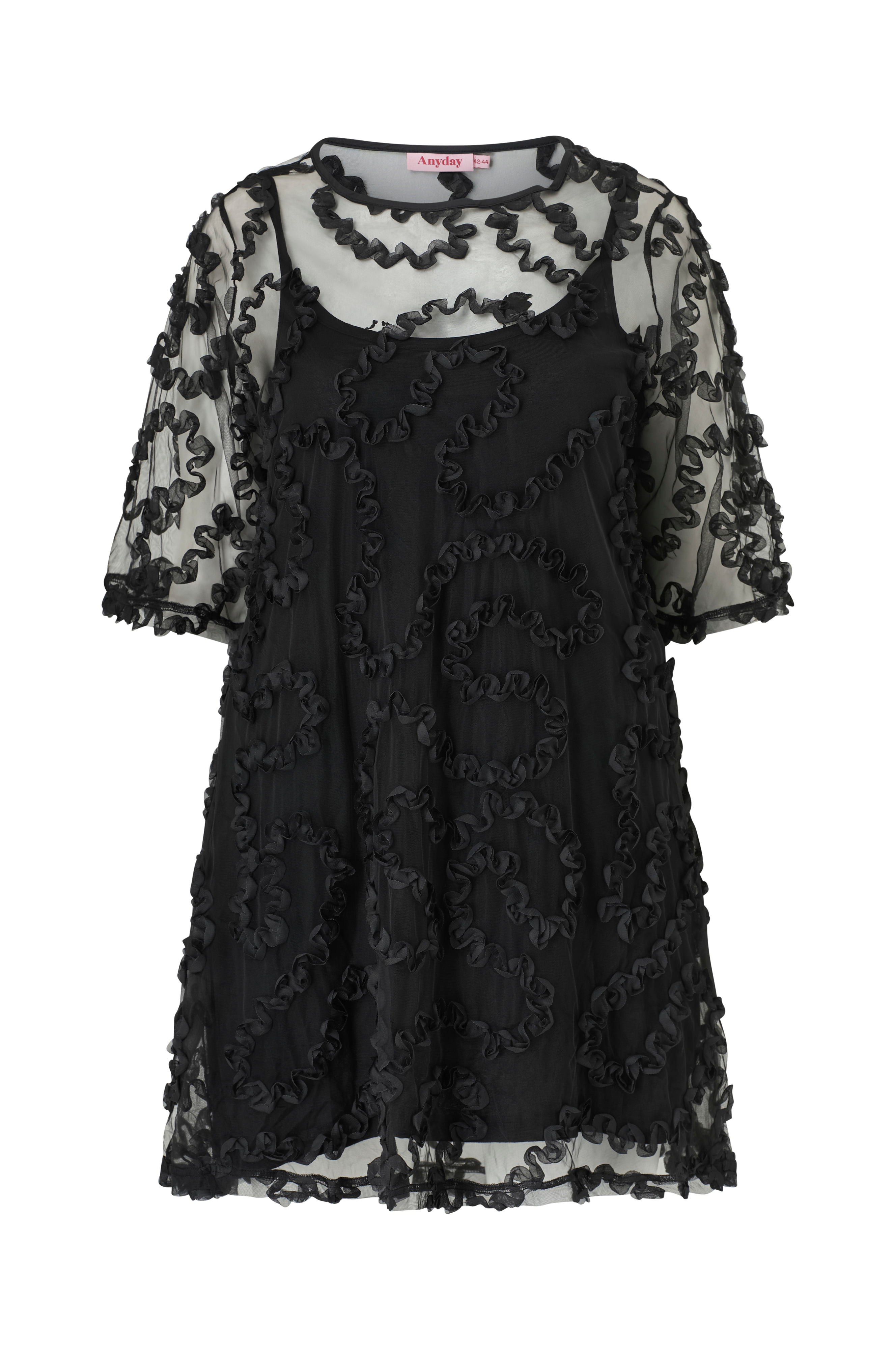 • Foret kjole i mesh med broderier med et blomstermønster• Rund halsudskæring• Korte ærmer• Længde: 95 cm i størrelse 42/44• Plusstørrelser
