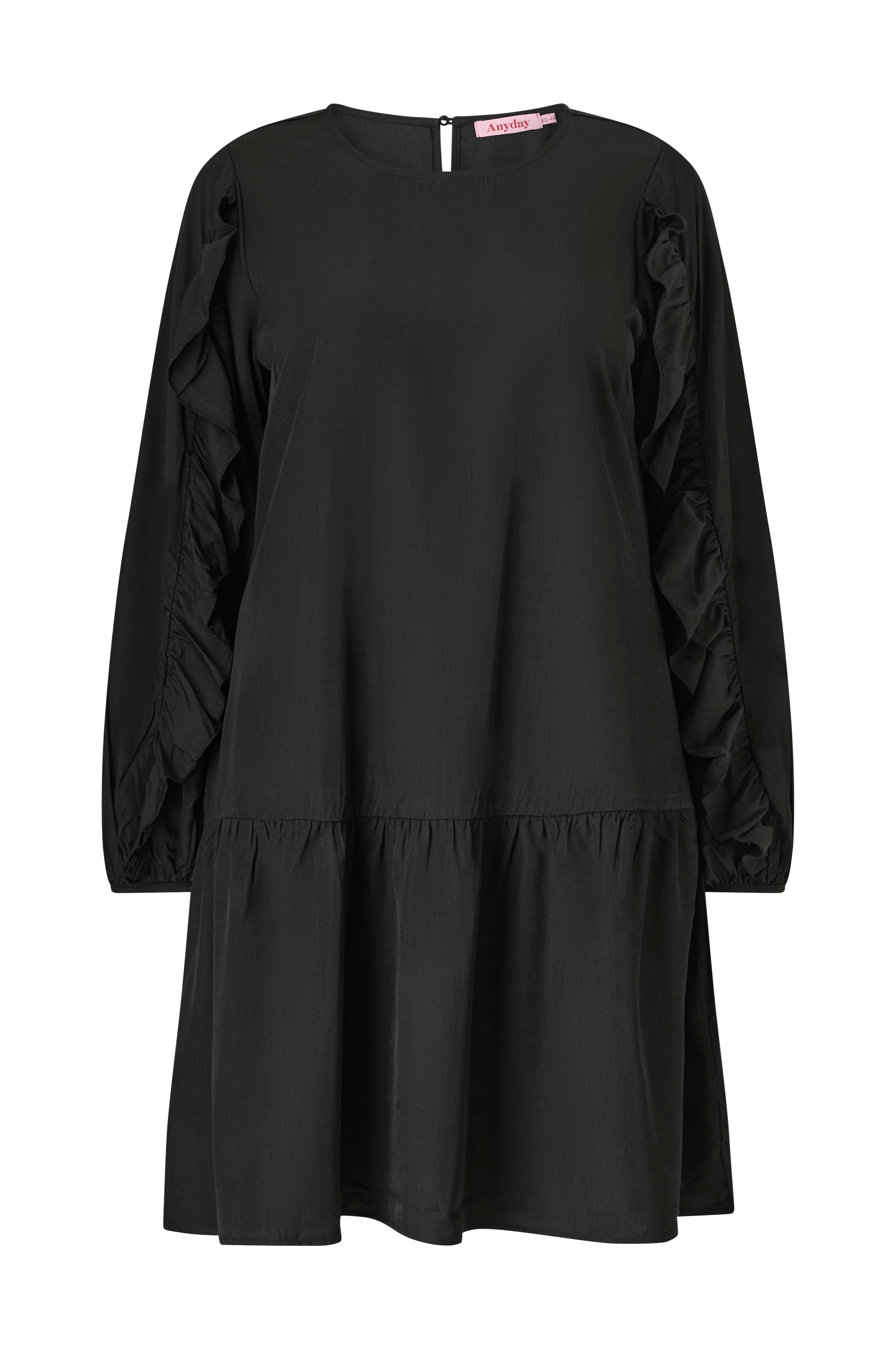 • Skinnende kjole i viskoseblanding• Rund halsudskæring• Slids med knap bagpå• Lange ærmer med volanter ved siden af• Båndkant ved ærmeafslutningerne• Bred volant nederst• Plusstørrelser• Længde: 104 cm i størrelse 42/44