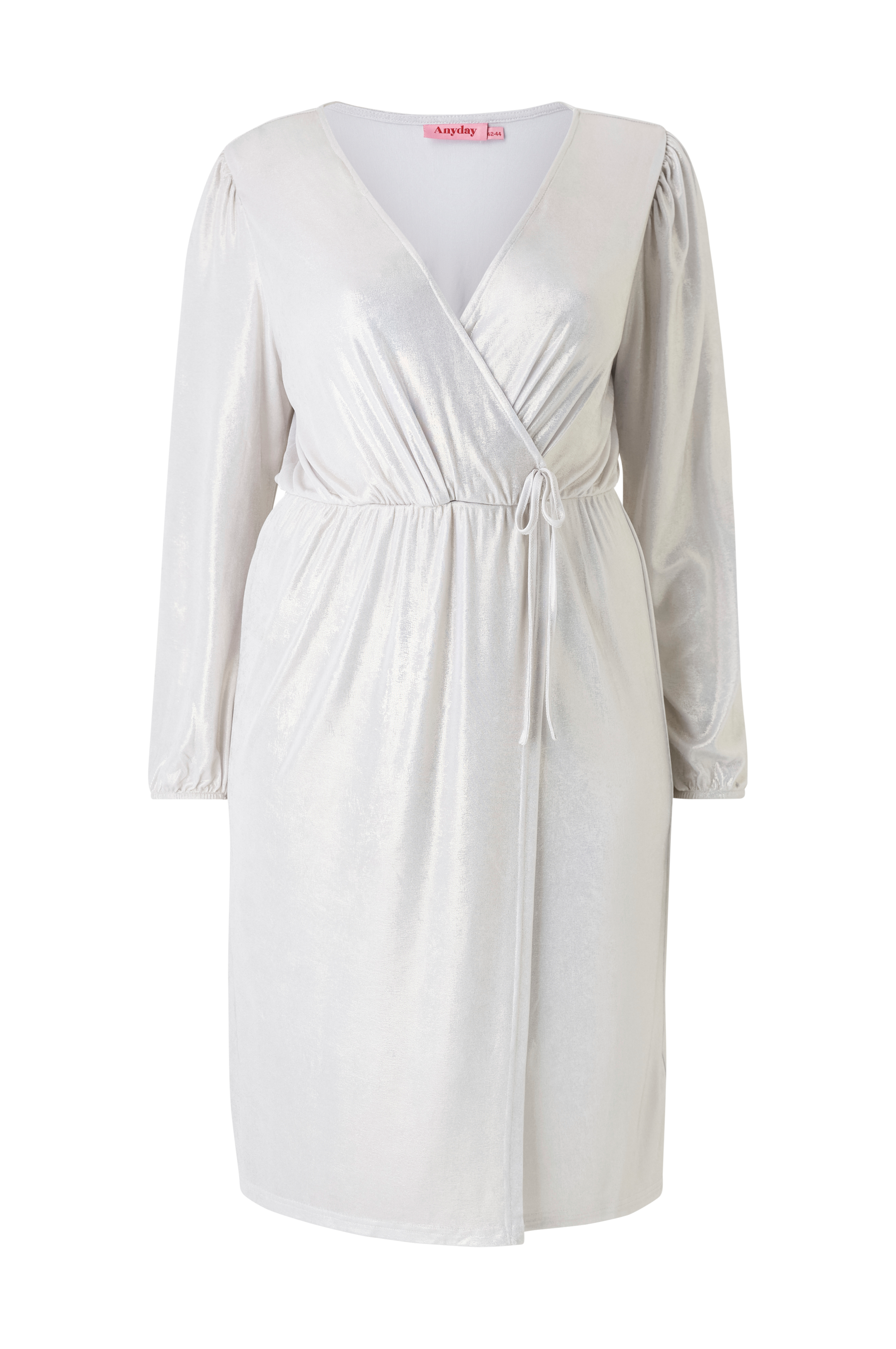 • Store størrelser• Sølvagtig model i jersey• Slå-om design• Ekstra langt ballonærme med elastik ved manchetterne• Defineret, elastisk talje med dekorativ sløjfe• Længde: 117 cm i størrelse 42/44