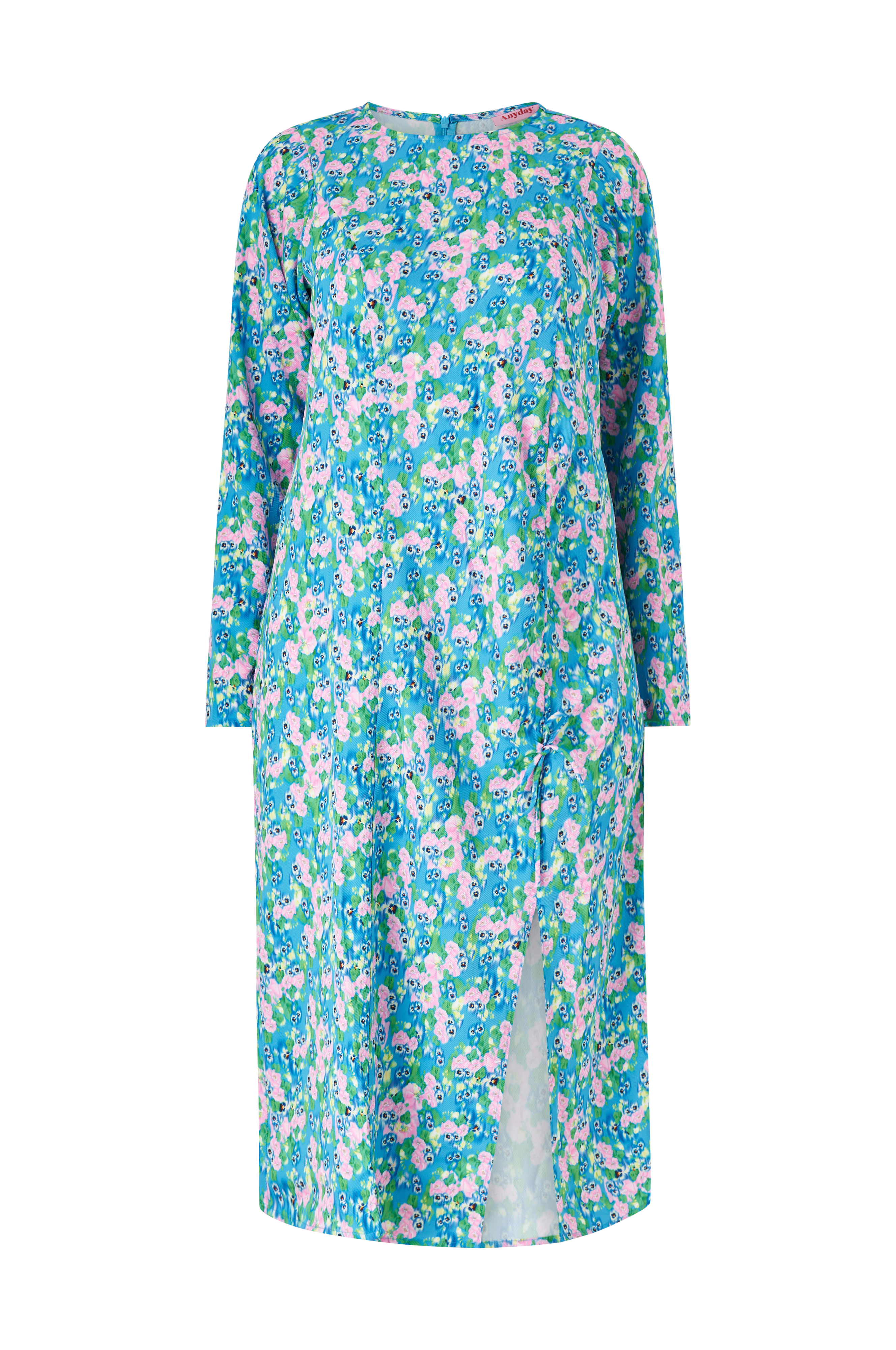 • Printet blomstermønster• Rund halsudskæring• Skjult lynlås bagpå• Lange ærmer• Rynket detalje med bindebånd foran• Slids i den ene side• Store størrelser• Længde: 128 cm i størrelse 42/44