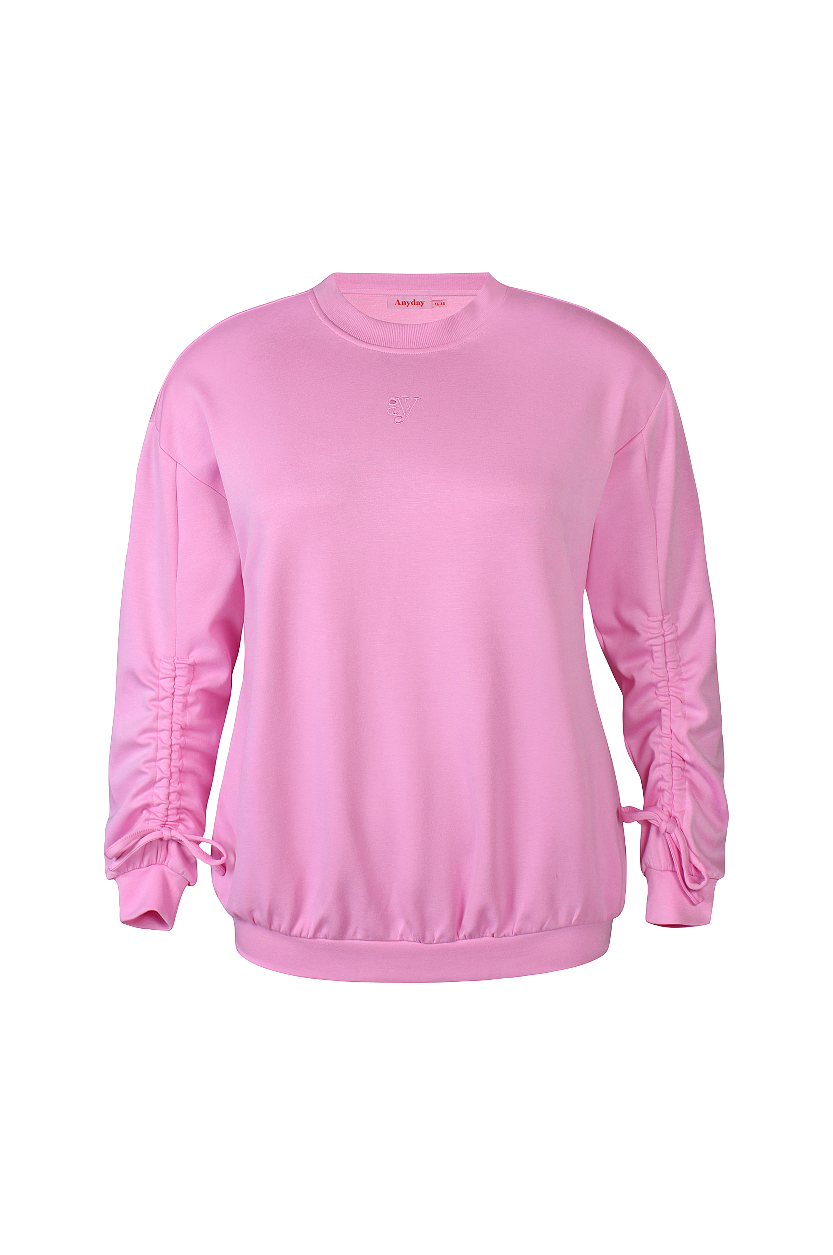 • Løs pasform• Rund, ribbet halsudskæring• Rynkede ærmer med bindebånd ved ærmeafslutningerne• Manchetter ved manchetterne og nederst• Store størrelser