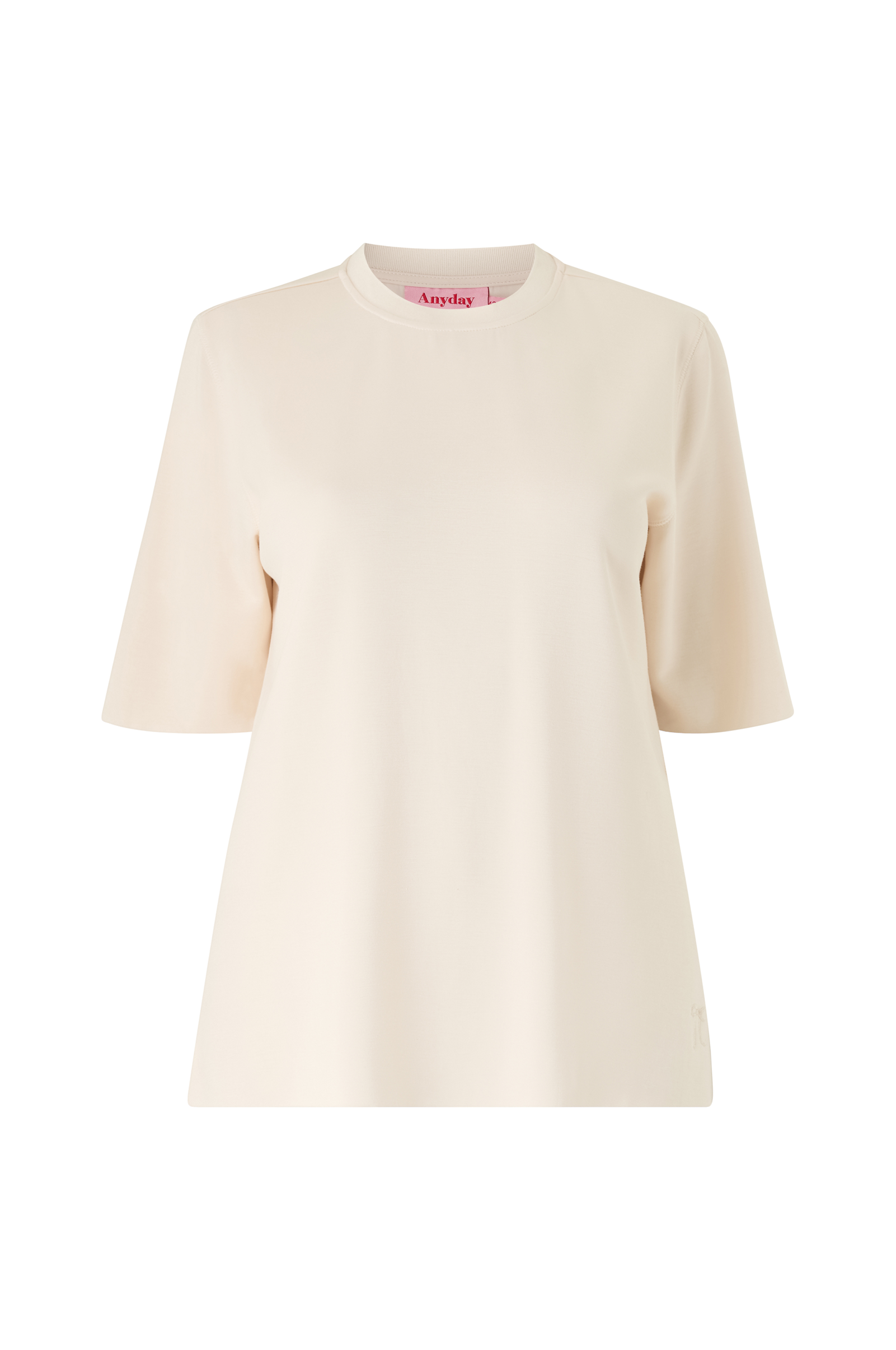 • Blød, elastisk t-shirt med rund, ribbet halsudskæring• Slids nede i siderne• Broderet sløjfe nederst i den ene side• Rå kanter ved ærmeafslutningerne og ved nederste kant• Plusstørrelser