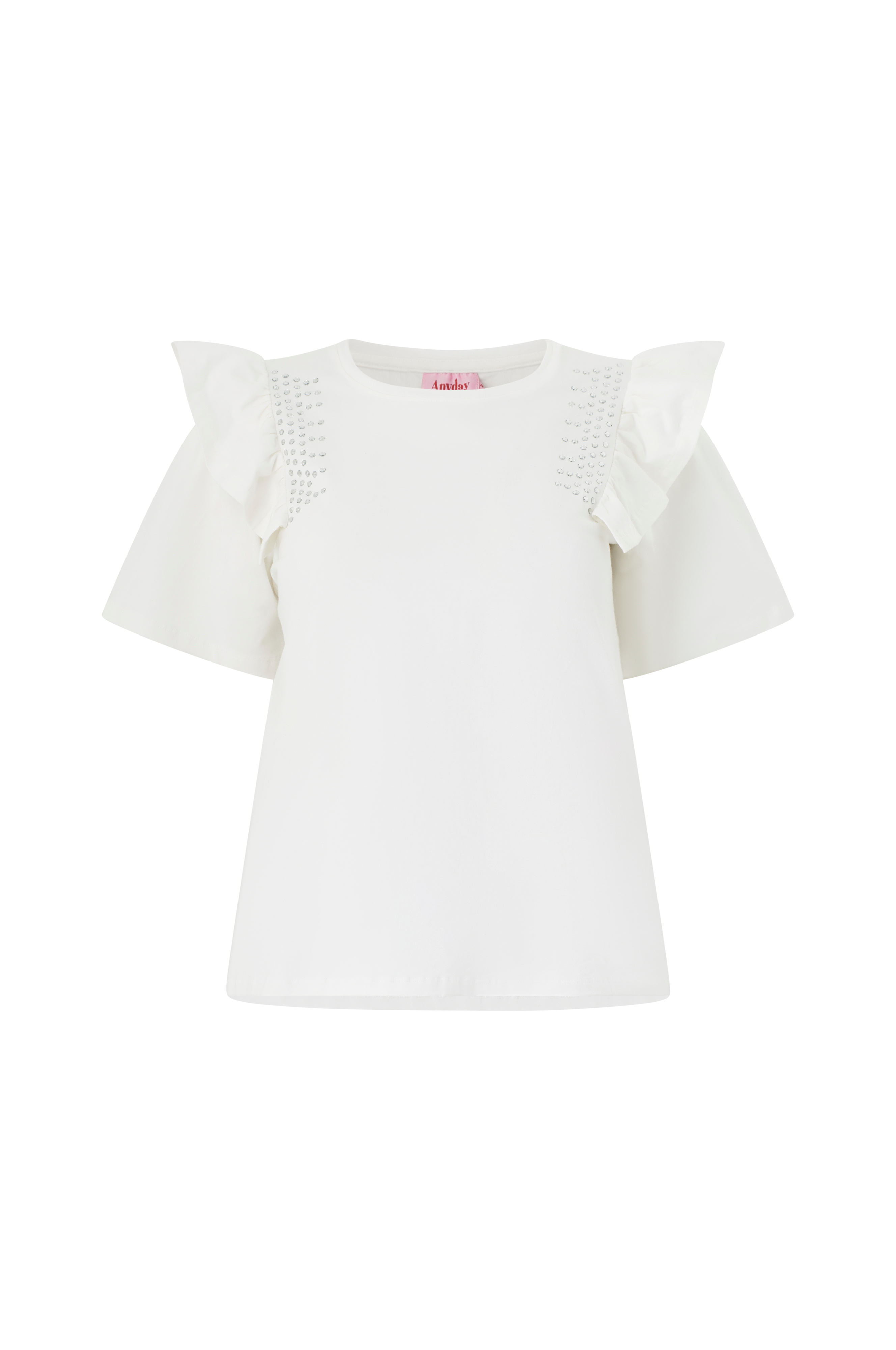 • T-shirt i blød bomuldsblanding med flæsedesign over skuldrene• Ærme• Afrundet halsudskæring med tynd ribmanchet• Funklende detalje med sten på brystet• Store størrelser