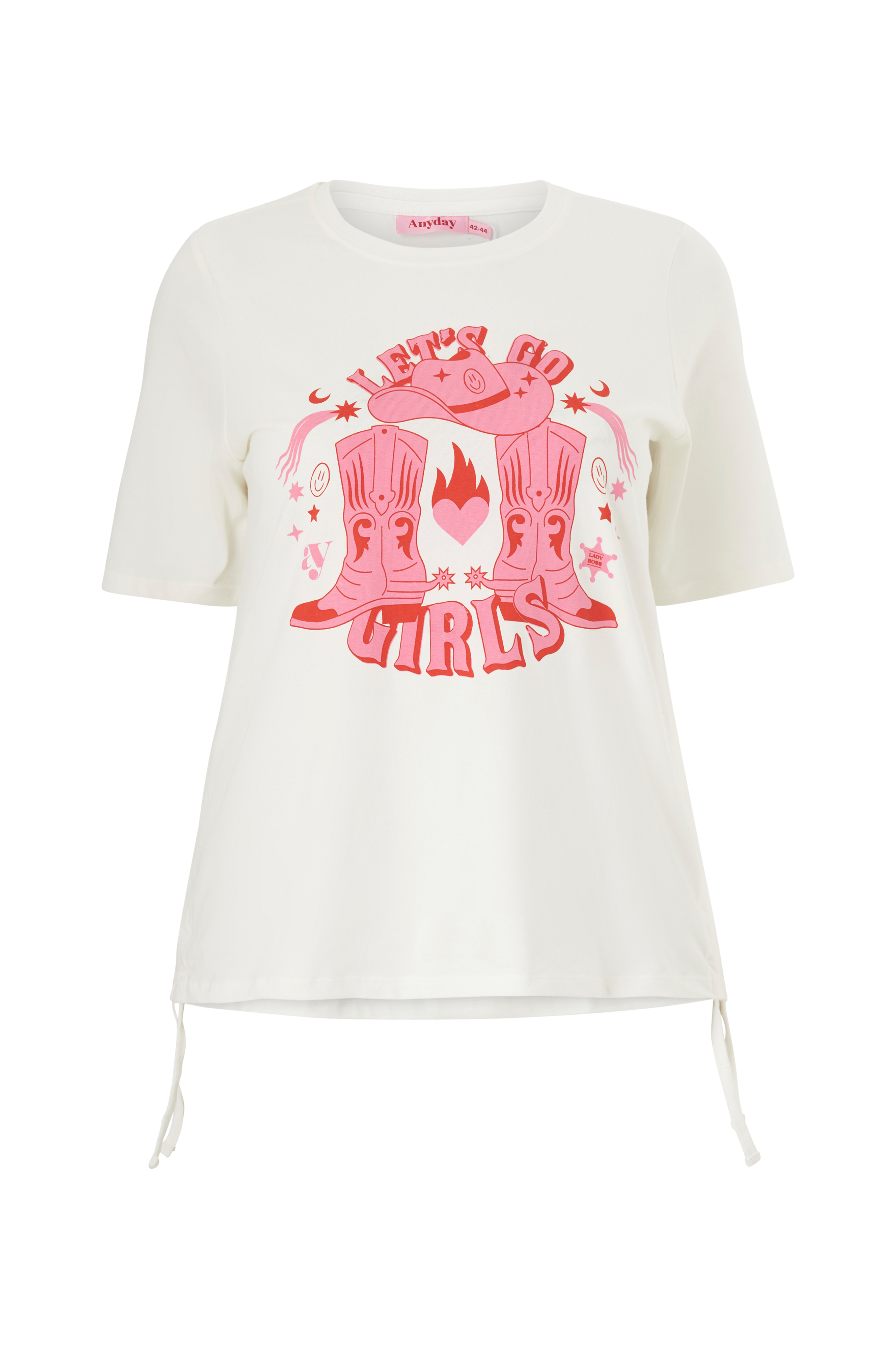 • Lige, uformel model• Stort tryk foran• Ribbet rund hals• Kort ærme• Træksnørre med bindebånd nede i siderne
