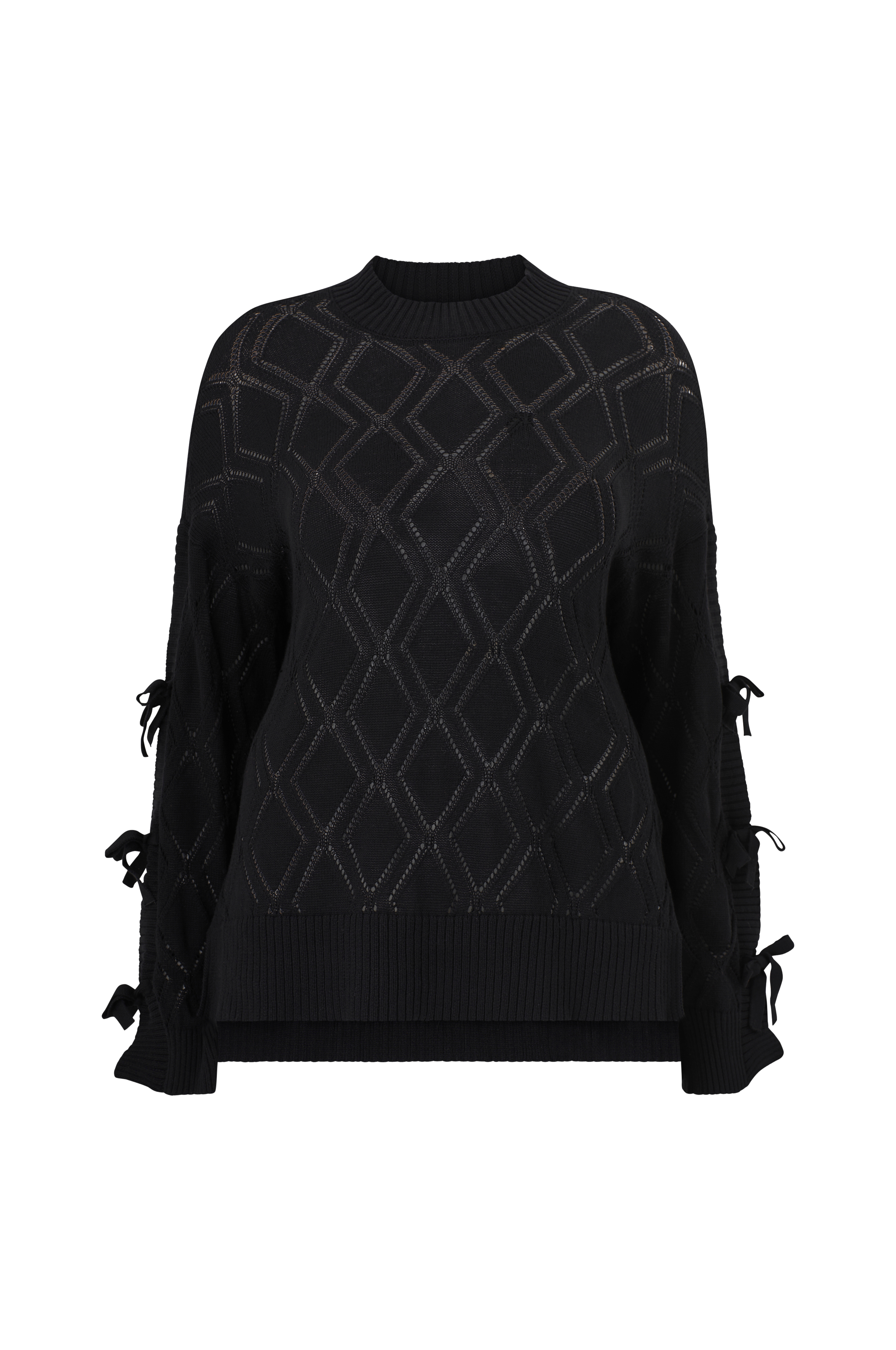 • Store størrelser• Bred, mønsterstrikket model• Rund hals med bred ribstrik• Nedsænket skulder• Ærme med svaj med åbning og strikkede bindebånd på oversiden• Slids nede i siderne med længere bagside