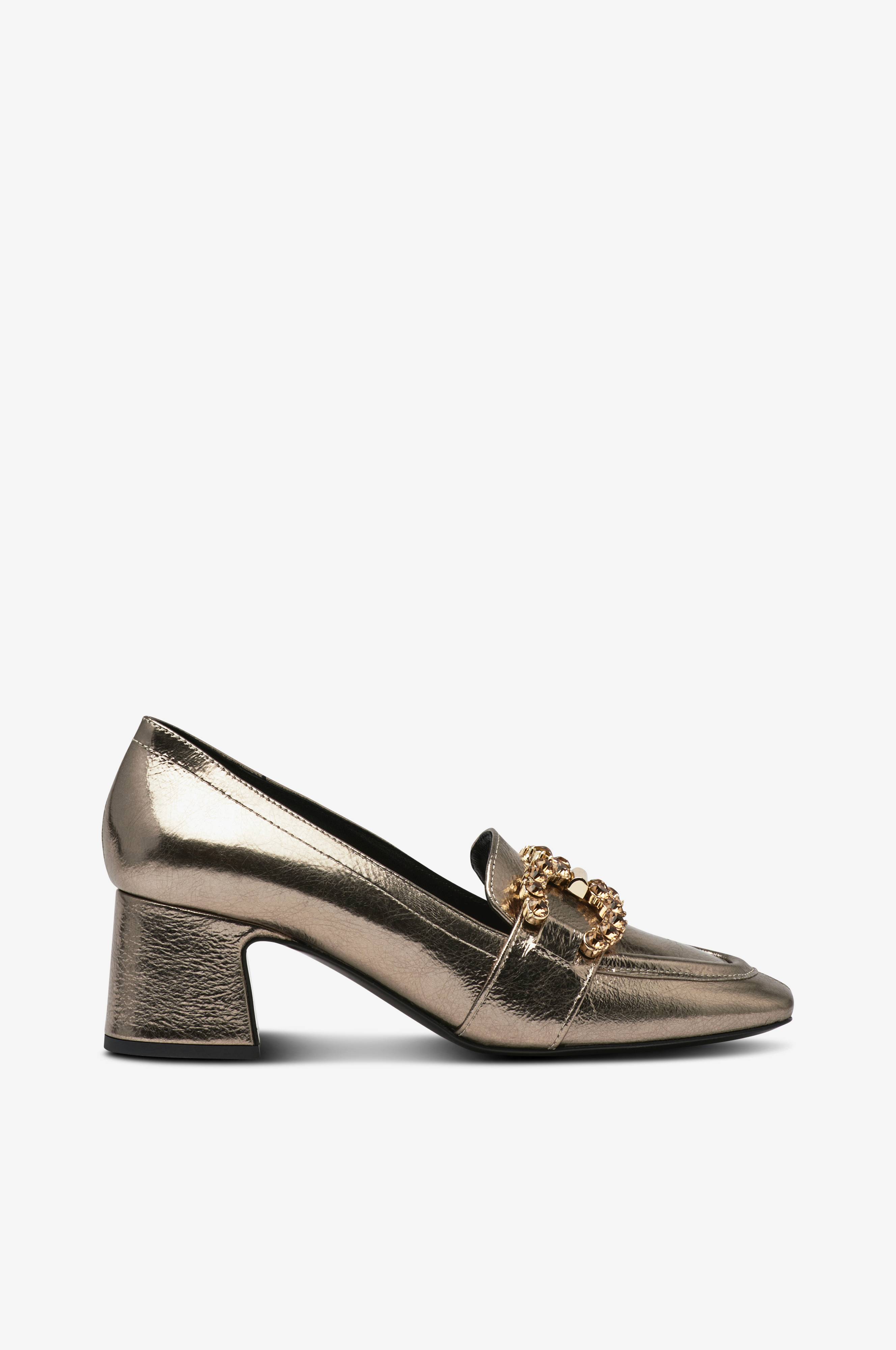 • Glat model i læder• Spænde med rhinstene på foden• Beklædt hæl• Læderforet• Hælhøjde: 6 cm