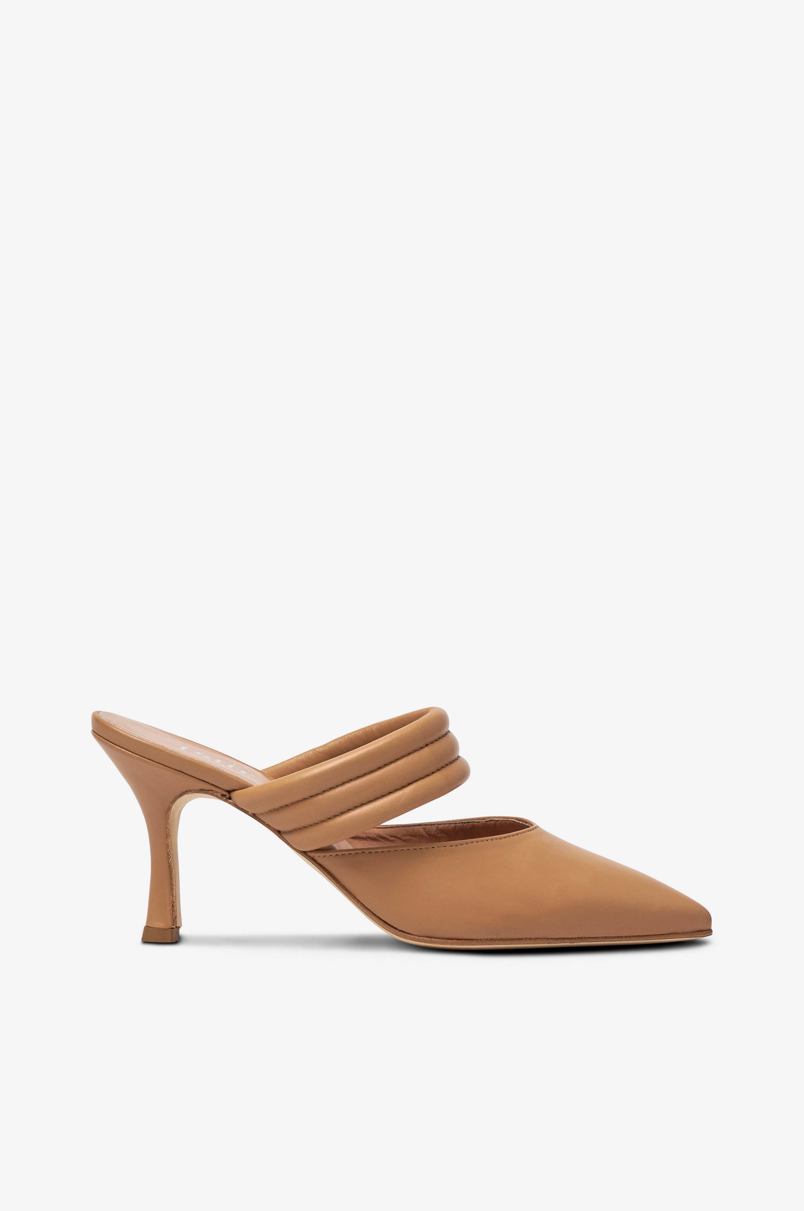 Højhælede sandaler med spids tå og let vatteret, riflet rem over foden. I skind. Hælhøjde ca. 8 cm.